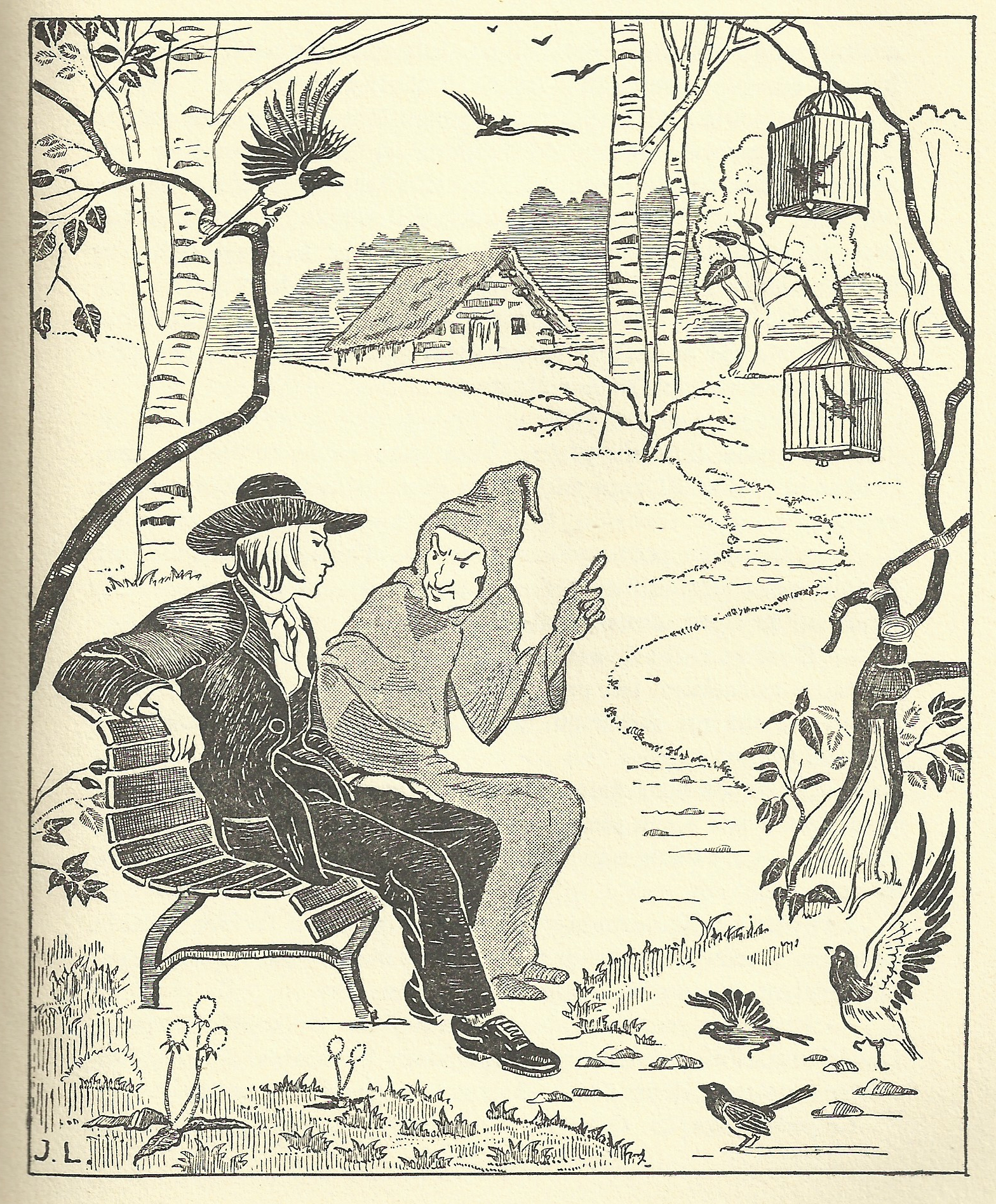 Par une belle journée de juillet, il mit ses petits amis emplumés sur les branches parfumées, parmi la verdure brillante et agitée ; il marchait dans l’allée, écoutant ses oiseaux siffler, gazouiller et pépier. Puis il s’assit sur un banc vert, et s’absorba dans ses réflexions. Il lui fallait trouver une rime au mot.
