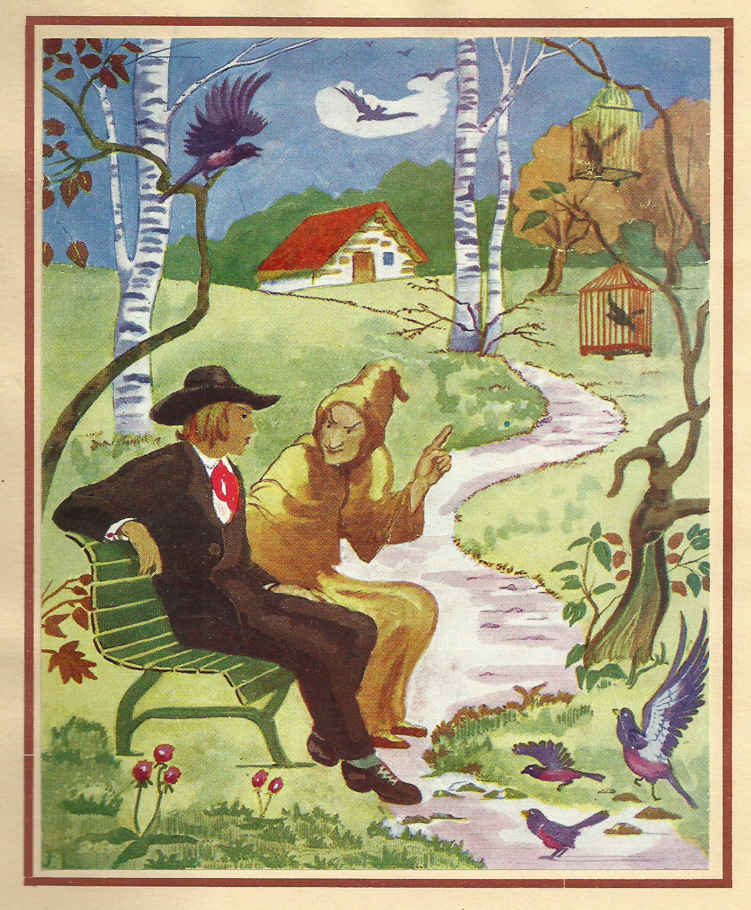 À peine le moineau eut-il dit : « Tsvirk ! » qu’aussitôt, sans retard, le poète se retrouva sur le petit banc vert. Au-dessus de sa tête, sur deux rangées, les cages étaient suspendues aux branches des bouleaux, mais le petit vieux n’était plus là ; il avait disparu.