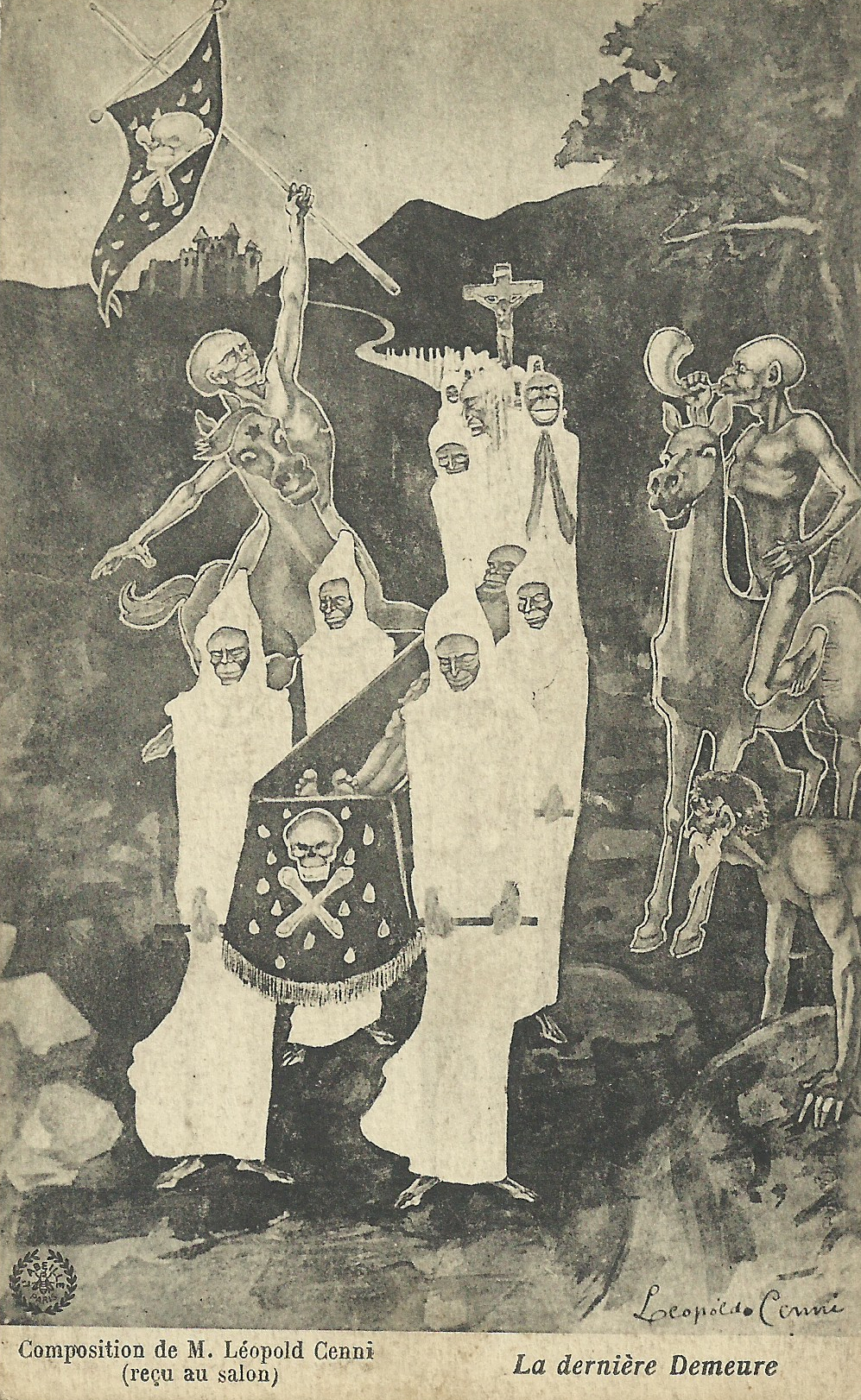 Le tableau original, signé Leopoldo Cenni, est daté de septembre 1913. Il représente la fameuse messe noire célébrée par l’abbé Guibourg officiant sur le corps nu de la marquise de Montespan, lui servant d’autel.