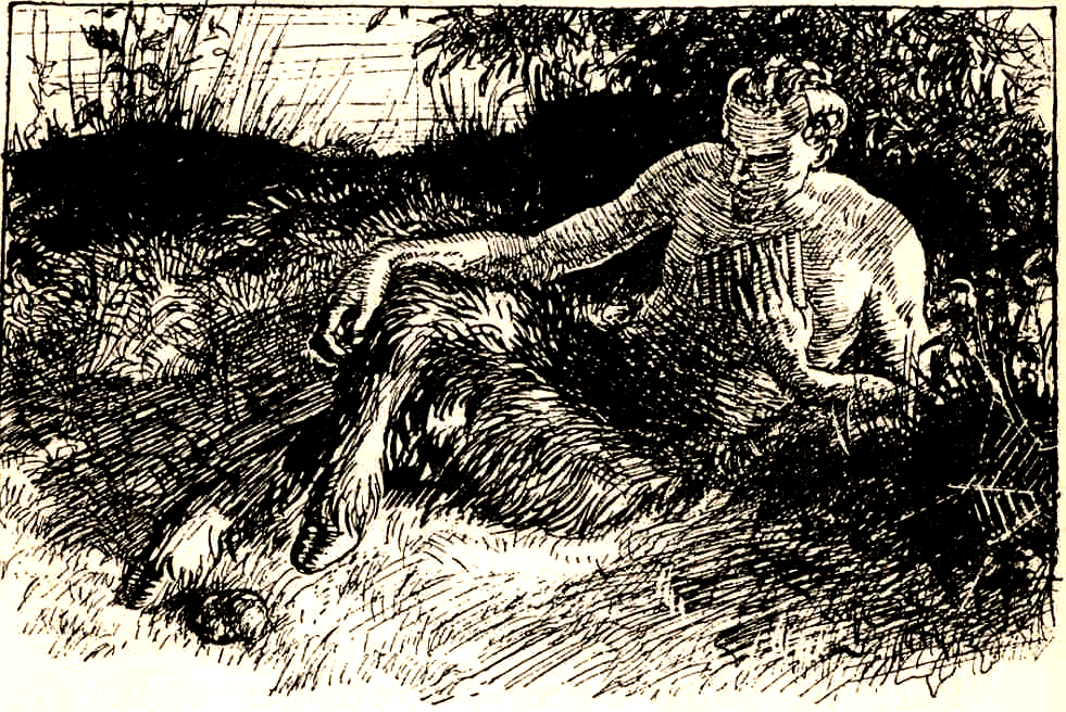 Taupe se sentit saisi d’une grande frayeur respectueuse ; il était sans forces, ses pieds cloués au sol. Il n’y avait rien de terrifiant dans cette frayeur qui l’envahissait. Il se sentait au contraire heureux et rempli d’une grande paix. Cette crainte le possédait ; il ne voyait rien autour de lui et pourtant il avait l’impression très nette qu’une Présence Auguste était près de lui. Il dut faire un effort pour se tourner vers son ami : il le vit, à son côté, atterré, brisé, tremblant de tous ses membres. Un silence intense continuait à régner parmi tous ces arbres peuplés d’oiseaux, tandis que la lumière montait, montait. Bien que tout bruit eût cessé, Taupe n’aurait sans doute pas osé lever la tête si l’appel ne s’était pas fait entendre de nouveau, dominateur et impérieux. Il fallait y répondre, sans hésiter, dût-il en mourir, car il lui était donné à voir ce que l’on cache – avec raison – aux yeux des mortels. Tremblant, il releva humblement la tête : là, dans la clarté radieuse de l’imminente aurore, tandis que la Nature revêtue de sa parure aux couleurs éclatantes semblait elle aussi attendre quelque chose, ses yeux rencontrèrent les yeux de l’Ami, du Protecteur. Il vit la ligne fuyante des cornes recourbées, étincelantes sous les feux naissants du jour ; il vit le nez sévère et crochu entre des yeux empreints de bonté qui le regardaient avec un pointe d’humour ; il vit les coins de la bouche barbue se relever dans un demi-sourire ; il vit les muscles onduleux du bras reposant sur la large poitrine, la main longue et souple qui tenaient les pipeaux à peine échappés des lèvres entrouvertes. Il vit, dans une attitude à la fois aisée et majestueuse, la forme superbe des membres velus ; et, enfin, il vit, blotti entre les sabots du dieu, et dormant d’un sommeil profond, heureux et paisible, un petit enfant joufflu, potelé, le fils de Loutre. Taupe, haletant, vit tout cela en un instant, clairement, dans la lumière du matin. Il regardait et il vivait… il vivait et il s’étonnait.