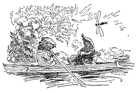 Taupe continuait à ramer en silence. La rivière se divisait, envoyant d’un côté un petit cours d’eau paisible. « Par là, » fit Rat d’un léger signe de tête. La lumière du jour montait de plus en plus de toutes parts ; on commençait à distinguer les couleurs des fleurs qui émaillaient la rive.
