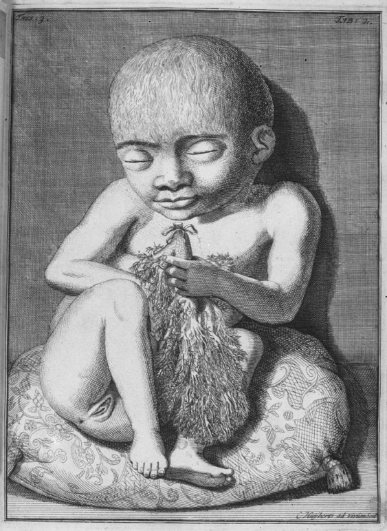 Elle écouta les gens et leur montra son fils ; il avait des jambes et des bras courts comme des nageoires de poisson ; une tête boursouflée en forme de grosse boule, qui avait peine à se dresser sur le cou mince et frêle ; le visage était tout sillonné de rides, comme celui d’un vieillard ; les yeux étaient troubles, et la bouche se fendait en un sourire inerte.