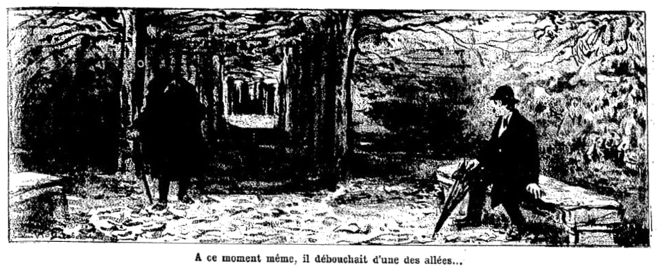 Assis sur un banc, que j’avais choisi pour me reposer un instant et dont je caressais de la main le marbre velu de mousse, je méditais ces impressions, quand je crus entendre un bruit de pas. Je prêtai l’oreille. Je ne m’étais pas trompé. Le pas se rapprochait. Soudain, j’éprouvai une curiosité sympathique pour le promeneur invisible. À ce moment même, il débouchait d’une des allées aboutissant au rond-point où je me trouvais et qu’il traversa lentement, sans me voir. C’était un homme âgé, à en juger d’assez loin. Il marchait pesamment en s’aidant d’une canne. Il était enveloppé d’une vaste houppelande et coiffé d’un feutre à larges bords d’où s’échappaient par derrière des cheveux longs. Il portait des culottes et des bas de bicycliste. Ce devait, sans doute, être quelque peintre, et son allure, quoique un peu bizarre, ne manquait pas de dignité. Mais le plus singulier, c’était qu’en l’apercevant, j’avais été sur le point de me lever. Oui, j’avais l’impression que c’était moi qui troublais sa promenade et non lui qui dérangeait ma rêverie, et quand il eut disparu, j’éprouvai un malaise si indéfinissable que je quittai mon banc et que je pris une des allées qui ramènent vers les parterres.