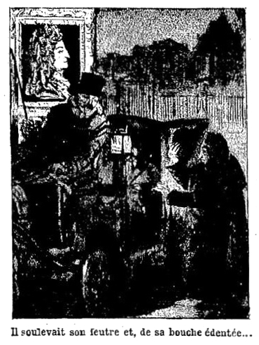 Un coup sec frappé à la vitre du fiacre et son arrêt brusque me tirèrent de ces réflexions. Mon étrange compagnon avait ouvert la portière et mis pied à terre. Il soulevait son feutre et, de sa bouche édentée où les mots sifflaient un peu, je l’entendis me dire :