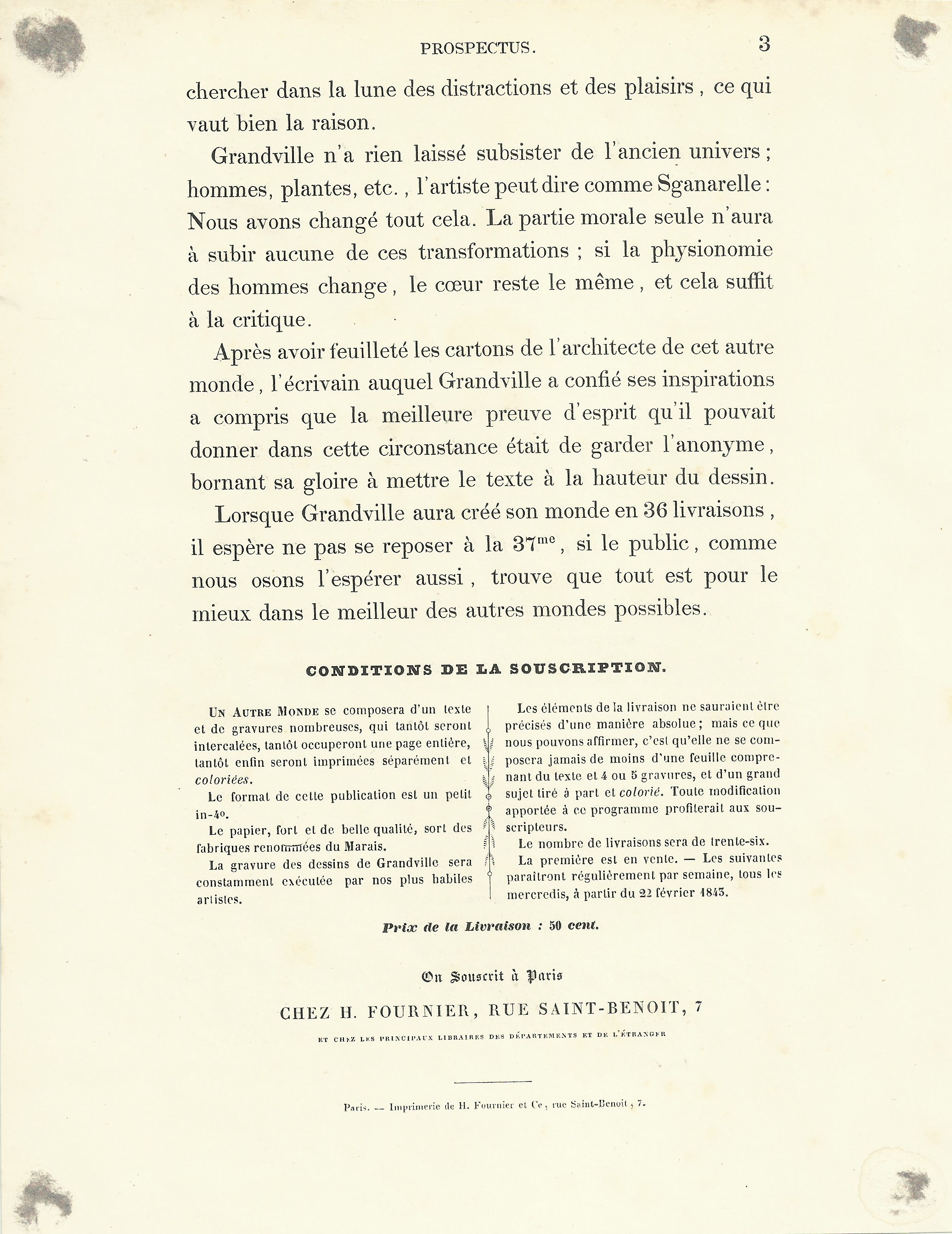 Les pages 1 et 2 sont malheureusement manquantes, le prospectus ayant été découpé pour contrecoller la gravure, comme en témoignent les quatre points au verso du feuillet.