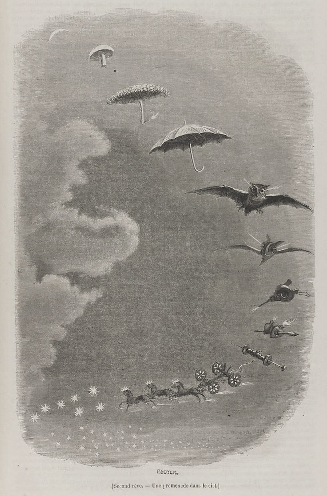 Dans un doux songe qui la berce, elle aperçoit derrière un pâle nuage le croissant argenté (à son premier ou dernier quartier ou octant). Tout à coup, le croissant se transfigure en la simple forme d’un humble cryptogramme… puis d’une plante ombellifère… à laquelle succède une ombrelle, qui va se transformer en une orfraie ou chauve-souris aux ailes étendues et dentelées… Notre rêveuse ne mêle-t-elle pas ensemble ses achats du marché avec les souvenirs d’une promenade en plein champ, où elle aura rencontré le vénéneux champignon et cet arbuste en forme de parasol ; avec les souvenirs de l’astre argenté qu’elle a contemplé le soir d’une belle journée d’été, tandis qu’elle voyait voltiger devant elle une chauve-souris ; ou bien encore avec l’ombrelle qui lui avait servi à se garantir des feux du soleil couchant, et qu’elle agita pour chasser l’oiseau nocturne ? À mon avis, on ne rêve aucun objet dont l’on n’ait eu la vue ou la pensée lorsque l’on était éveillé, et c’est l’amalgame de ces objets divers entrevus ou pensés, à des distances de temps souvent considérables, qui forme ces ensembles si étranges, si hétéroclites des songes, au gré d’ailleurs de l’activité plus ou moins grande de la circulation du sang.