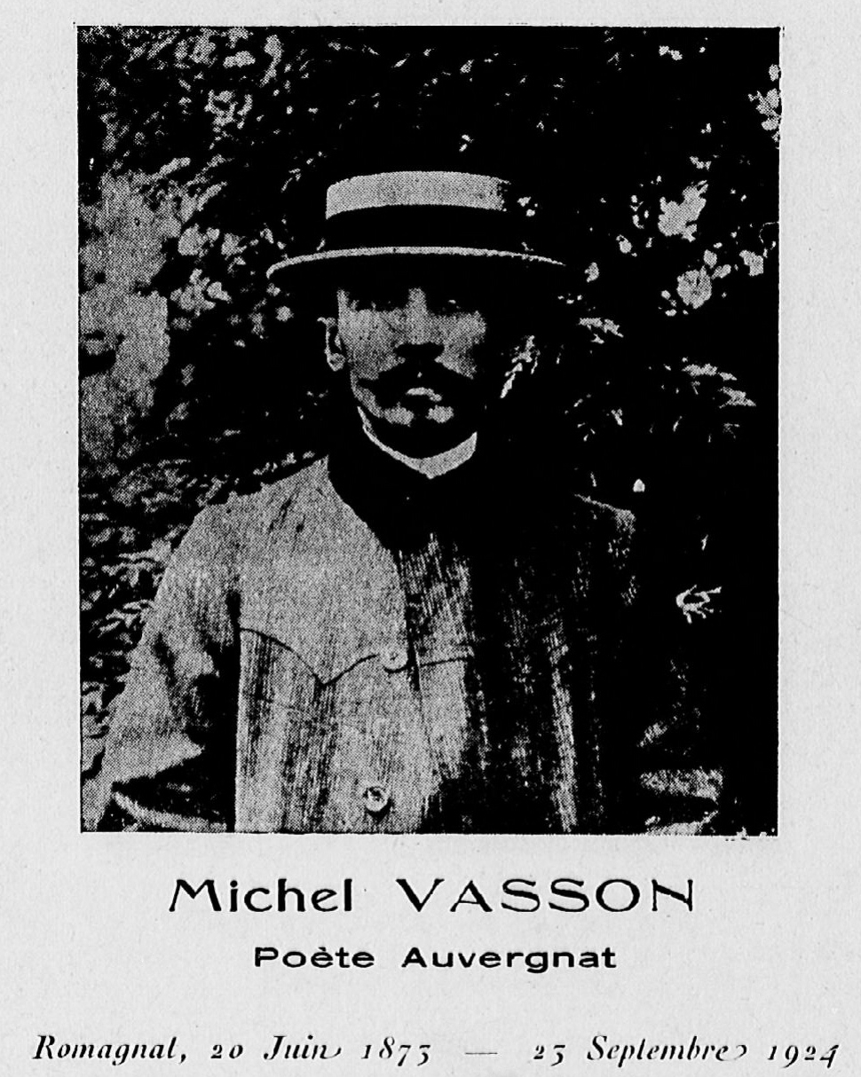 Le 23 septembre 1924, est mort à Romagnat, près Clermont, l’un des poètes les plus savants et les plus profonds de l’Auvergne. Gandilhon Gens-d’Armes lui a consacré un fraternel article dans l’Auvergnat de Paris, du 1er novembre, mais vous parleriez aujourd’hui de Michel Vasson à la plupart des Clermontois, ils vous diraient que ce nom leur est parfaitement inconnu.