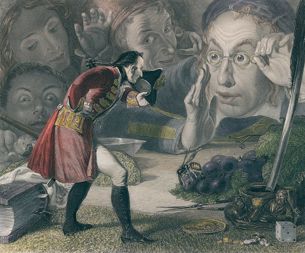 « En pleine mer, nous banquetans, gringnotans, devisans, et faisans beaulx et courts discours, Pantagruel se leva et tint en piedz pour discouvrir à l’environ. Puys nous dist : « Compaignons, oyez-vous rien ! Me semble que je oy quelques gens parlans en l’aer ; je n’y voy toutesfoys personne. Ecoutez. »