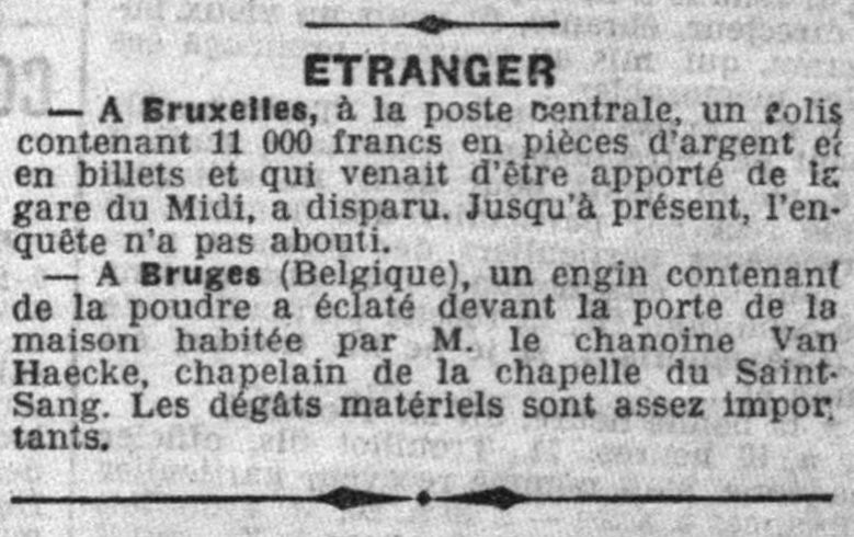 Cet entrefilet est paru dans La Croix, le 19 novembre 1907 ; la tentative d’attentat dont il est fait mention peut sembler d’autant plus curieuse lorsqu’on se rappelle que Louis Van Haecke, officiant à la chapelle du Saint-Sang, est supposé avoir servi de modèle au sinistre chanoine Docre, célébrant la messe noire à laquelle assiste Durtal, dans le roman Là-Bas de Huysmans.