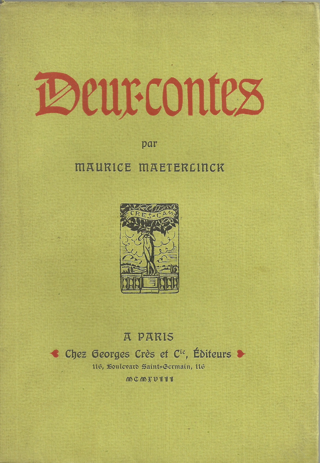 Maurice Mæterlinck, in Deux Contes ; ornements typographiques de Louis Jou, Paris : Georges Crès et Cie, 1918 ; tirage à 1200 exemplaires.