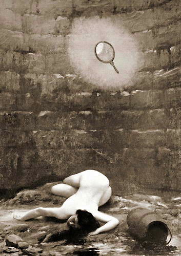 Il y eut quelque confusion dans les événements subséquents, ainsi qu’il arrive parfois aux endroits les plus importants des songes, car la raison nocturne a bien des détours ignorés. Mais je revois distinctement qu’une femme m’apparut, extraordinairement nette, à l’exception du visage, où des traits, en tout semblables à ceux d’Annie, luttaient et se mêlaient sans interruption avec d’autres traits d’une indéfinissable impression, que j’appellerai, peu approximativement, « de réticence, et à la fois implicite et virtuelle » (et ce visage, je le reconnaîtrais néanmoins sans hésitation, « mais uniquement, je pense, durant la nuit » ; au surplus, il vaut mieux ne pas approfondir ces interpénétrations d’identité dans les songes). Je me rappelle ensuite que je fus arraché à l’eau du puits par un geste analogue à celui d’Annie à la fontaine, « en considérant uniquement le reflet de ce geste, c’est-à-dire, qu’il me sembla être sauvé par un bras nu qui sortait de l’eau. » Et après une incolore lacune, je me trouvai tout à coup en plein air, sous un ciel de pluie, d’orage et de soir, et celle qui m’avait sauvé, et qui m’embrassait « en me parlant une langue que je ne comprenais plus, » m’emportait le long de rues et de quais éclairés.