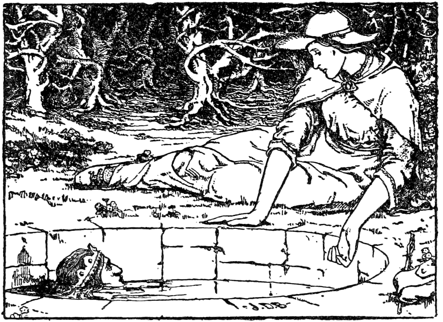 Qu’est cela ? – Après vint une autre femme, semblable à toi Annie, ou du moins, une presque en tout semblable à toi, sauf quant au visage qui était bien plus triste. Alors toi, ou elle, m’as tiré de l’eau en te penchant sur le puits comme tu fis vendredi soir à la fontaine, et tu m’emportas en tes bras (moi si grand et si lourd cependant) dans une ville que je n’avais jamais vue auparavant, et où, à droite, il y avait une vieille forêt de très hauts arbres, et au-delà, deux effrayants moulins à vents, « tels qu’il n’en existe pas ici, et dont un absolument sans ailes… »