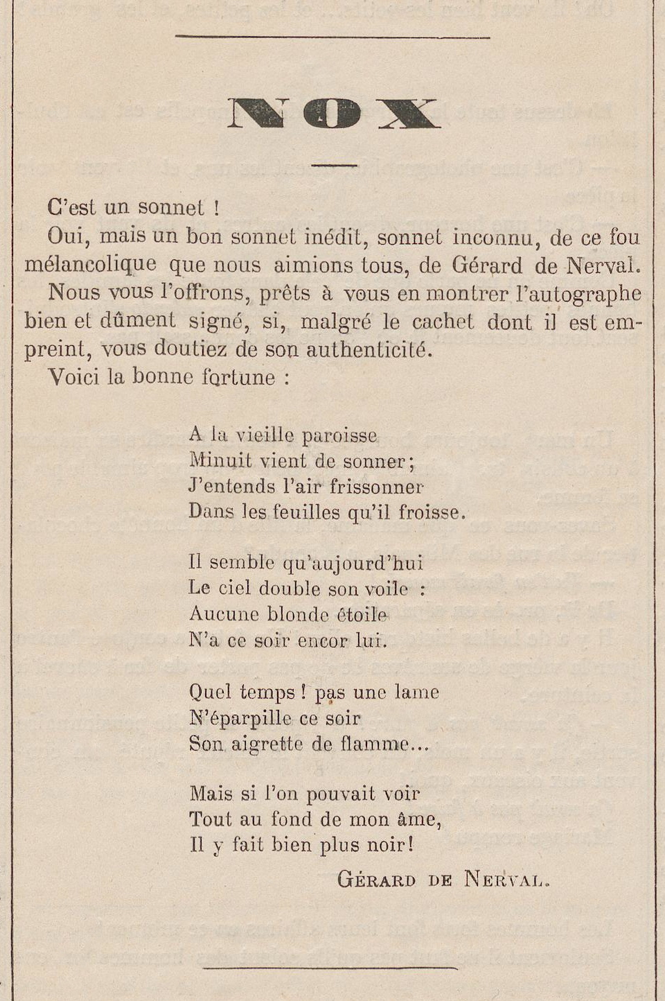 L’emploi de vers hexasyllabiques est peu fréquent chez Nerval et le sonnet peut paraître un peu faible ; quoi qu’il en soit, – véritable inédit, ou simple pastiche et mystification posthume, – il nous a semblé assez intéressant pour le reproduire ici.