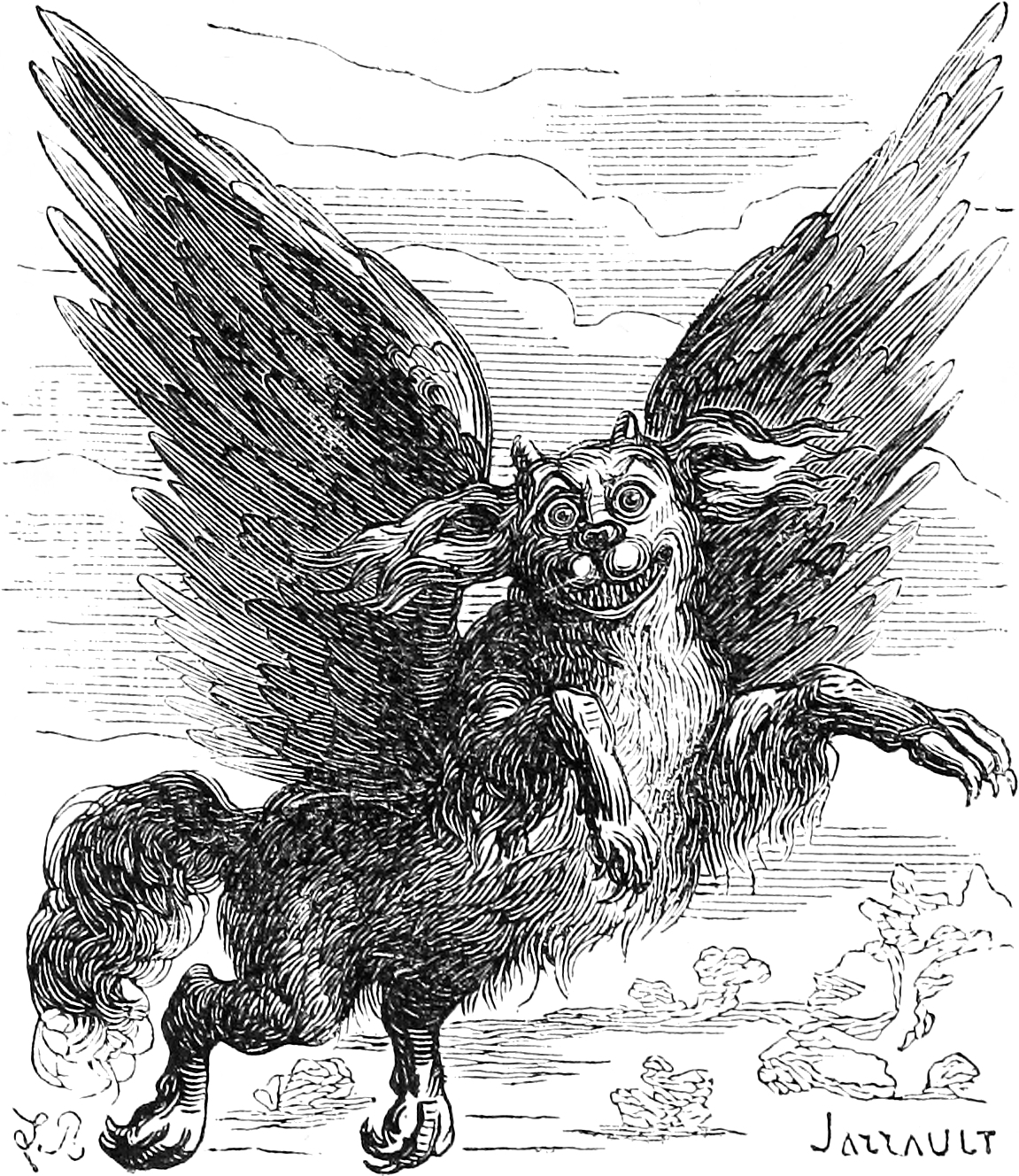 « On montre, en ce moment, à Varsovie, un chien ailé. Cet animal, à peine âgé de six mois, marche et vole avec une égale rapidité. Les ailes qu’il porte sur son dos ont une forme de circonférence et sont assez semblables aux ailes des chauves-souris. Il ne mange que du poisson cru et ne boit que de l’hydromel. »