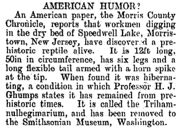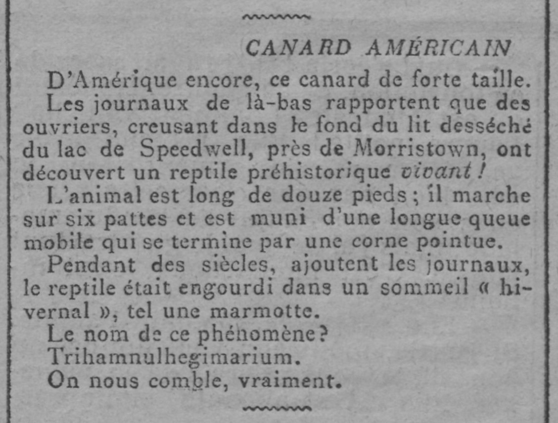 C’est ainsi que les journaux yankees rapportent que des ouvriers, creusant dans le fond du lac de Speedwell, près de Morristown, ont découvert un reptile préhistorique vivant !