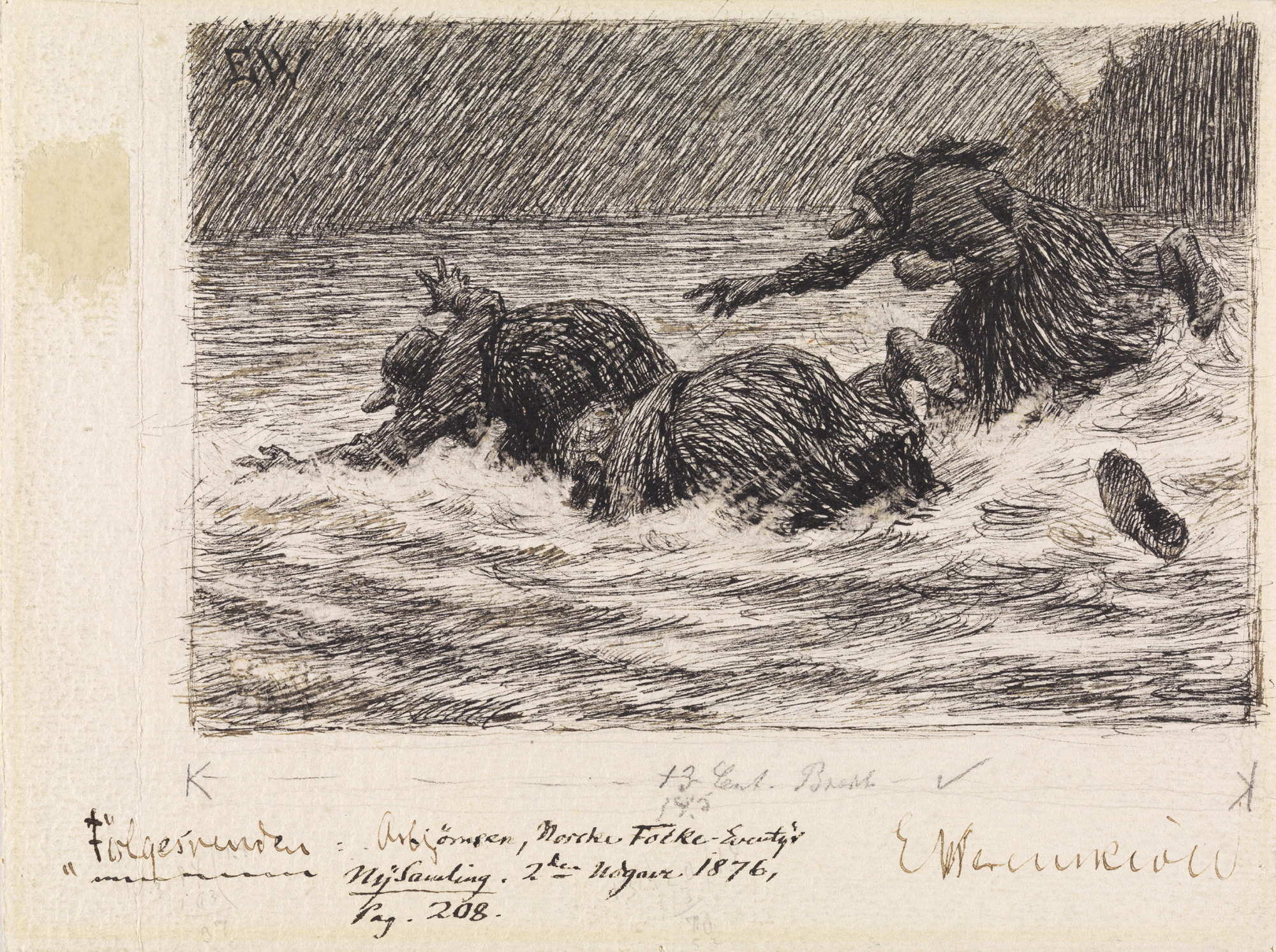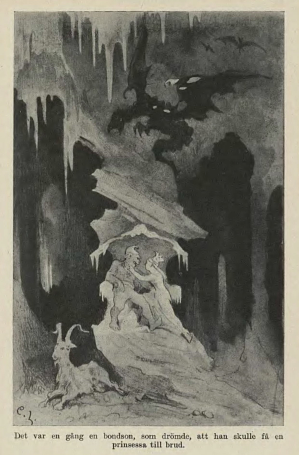(Peter Christen Asbjørnsen & Jørgen Moe, « Le Compagnon » [Følgesvennen], conte recueilli dans Norske Folkeeventyr, 1887, traduit du norvégien par P.-G. La Chesnais, in Mercure de France, tome XLIV, n° 155, novembre 1902. Les gravures sont tirées de l’édition originale ; ainsi que les deux épreuves, elles sont l’œuvre d’Erik Werenskiol ; la dernière illustration est de Carl Larson)