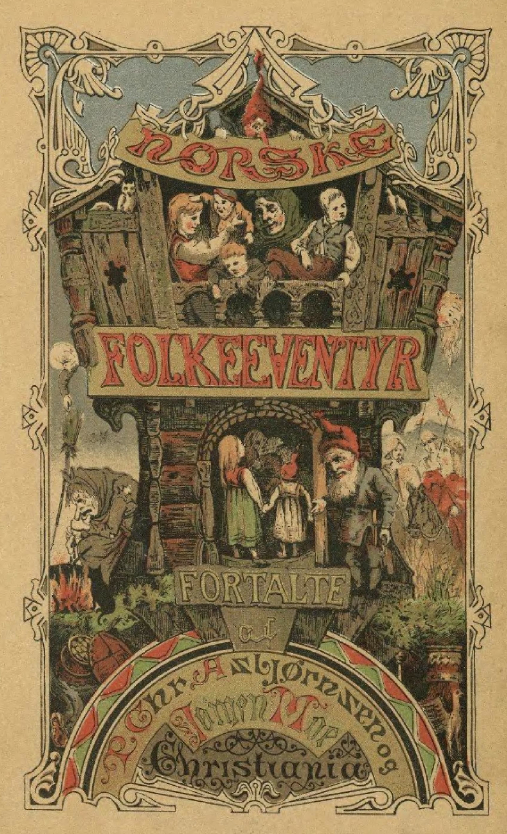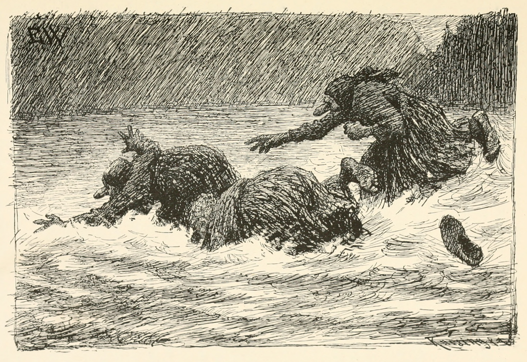 Au bout d’un certain temps, ils arrivèrent à un détroit. Le compagnon prit la pelote de fils d’or, et la lança si fort contre la montagne de l’autre côté du bras de mer qu’elle revint jusqu’à lui, et lorsqu’il l’eut jetée plusieurs fois, elle devint un pont. Sur ce pont, ils traversèrent le détroit et, lorsqu’ils furent arrivés de l’autre côté, l’homme dit au garçon de remettre les fils en pelote le plus vite qu’il pourrait, « car si ce n’est pas fait vite, les trois femmes-trolds vont arriver et nous mettront en miettes, » dit-il. Le garçon se mit à pelotonner le plus vivement qu’il put, et il ne restait plus que le dernier fil, lorsque les femmes-trolds arrivèrent en courant ; elles volèrent dans l’eau, virent le passage devant elles, et se précipitèrent sur le bout du fil ; mais elles ne surent pas le saisir, et se noyèrent dans le détroit.