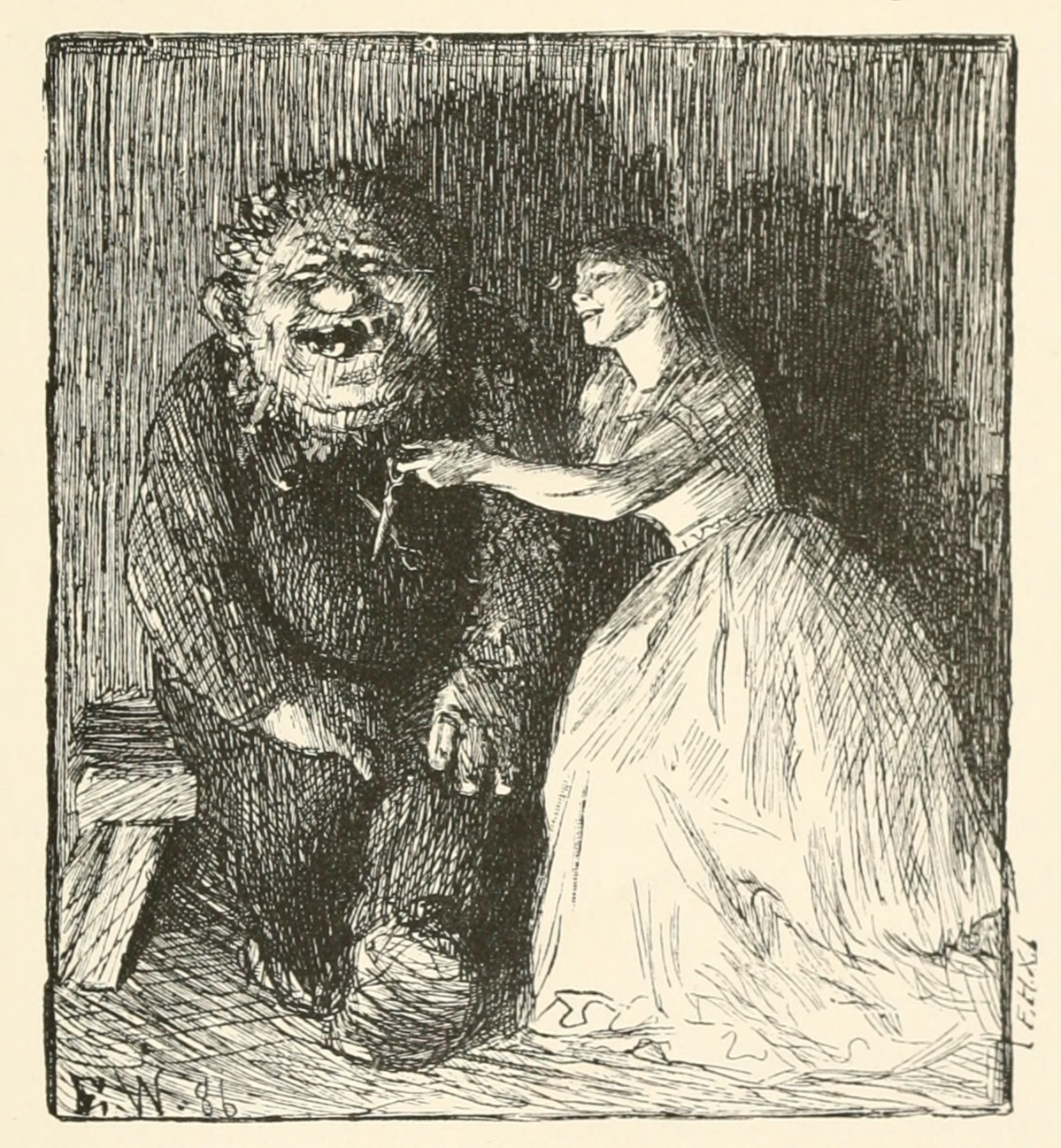 « Voilà qu’il est venu un nouveau prétendant qui veut m’épouser, il est jeune et beau ; mais je ne veux pas d’autre que toi, ajouta-t-elle, en câlinant le trold de la montagne. Alors, je lui ai donné une épreuve, et voici les ciseaux qu’il devait garder, garde-les maintenant, toi ! »