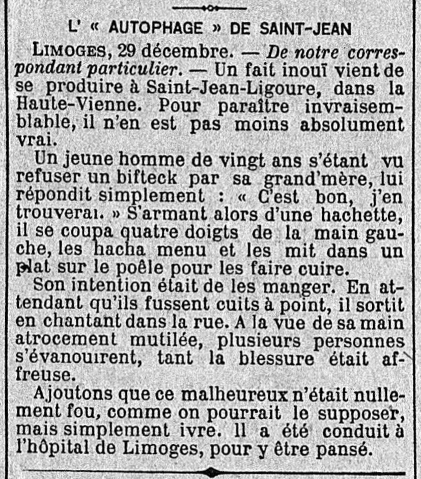 (in Le Matin, derniers télégrammes de la nuit, seizième année, n° 5788, samedi 30 décembre 1899. Cet appétissant fait-divers a connu un franc succès, puiqu’il a été repris ensuite dans L’Ouest-Éclair, journal quotidien d’informations, première année, n° 150, dimanche 31 décembre 1899 ; La Lanterne, journal politique quotidien, vingt-troisième année, n° 8289, lundi 1er janvier 1900 ; La Justice, journal politique du matin, vingt-et-unième année, n° 7267, mardi 2 janvier 1900 ; La Dépêche tunisienne, douzième année, n° 3474, mercredi 10 janvier 1900 ; et enfin, dans L’École et la famille, journal d’éducation, d’instruction et de récréation, vingt-huitième année, n° 7, à l’occasion du 1er avril 1903 !)