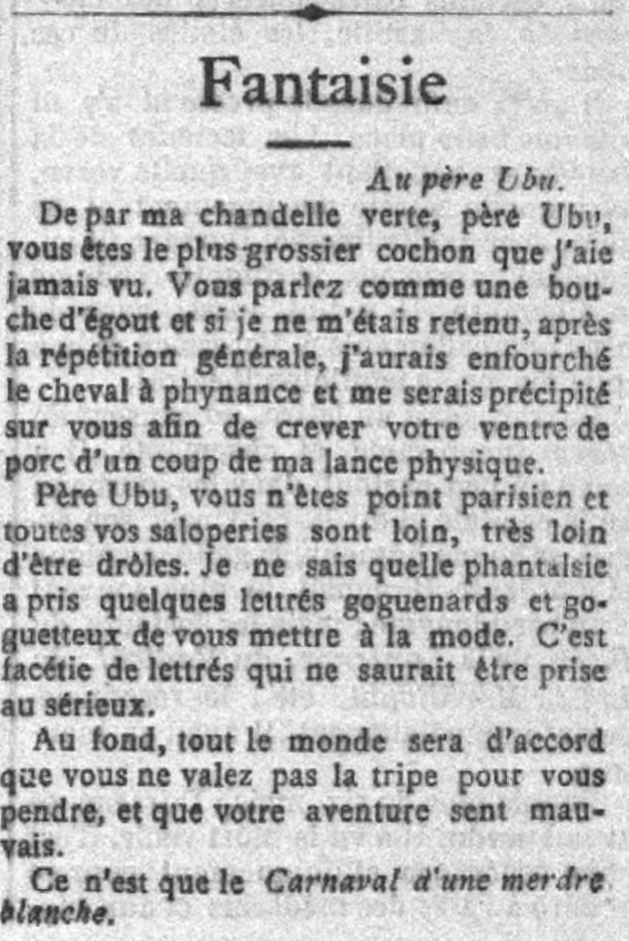 Quelqu’un, parmi le tohu-bohu des huées, a crié : « Vous ne comprendriez pas davantage Shakespeare ! » Il a eu raison. Entendons-nous bien : je ne dis pas du tout que M. Jarry soit Shakespeare, et tout ce qu’il a d’Aristophane est devenu un bas Guignol et une saleté de funambulesquerie foraine ; mais, croyez-le, malgré les niaiseries de l’action et les médiocrités de la forme, un type nous est apparu, créé par l’imagination extravagante et brutale d’un homme presque enfant.