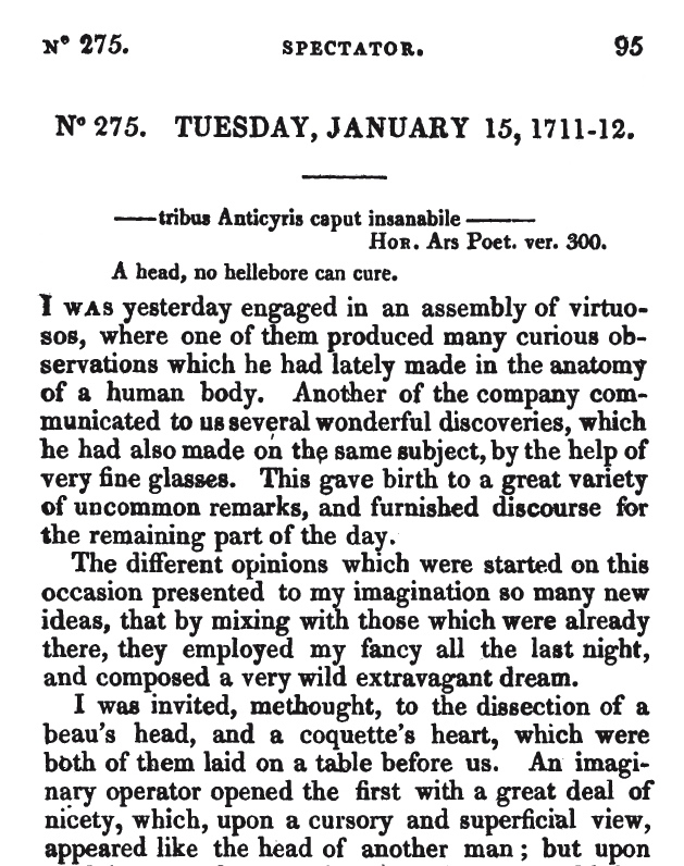 (Joseph Addison, « Dissection of a Beau’s Head » et « Dissection of a Coquette’s Heart, » in The Spectator, n° 275, mardi 15 janvier 1712, et n° 281, mardi 22 janvier 1712. Traduction anonyme et frontispice, in Le Livre singulier à l’usage des esprits bisarres, Paris : chez Rainville, Debray & Pigoreau, 1801)