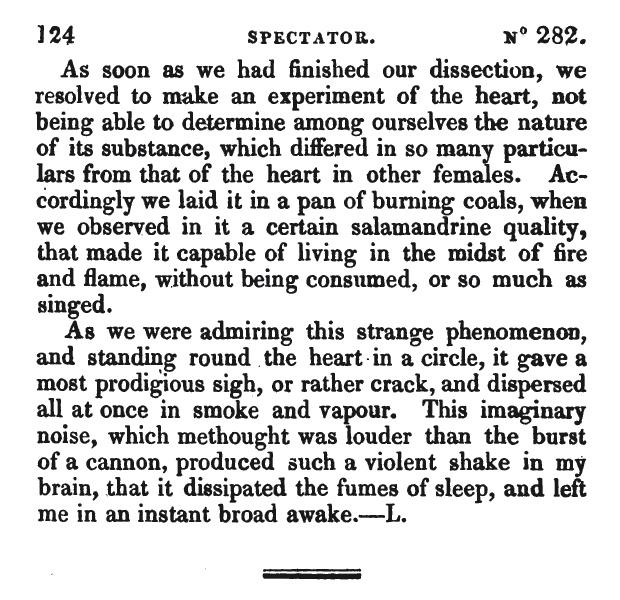 Aussitôt que notre anatomiste eût achevé sa dissection, incapables de nous déterminer sur la nature de ce cœur si différent de celui des autres femmes, nous résolûmes d’en venir à quelques épreuves pour en découvrir la substance : on le mit alors sur des charbons ardents ; mais bien loin de se consumer, il n’en reçut pas la moindre atteinte ; d’où nous conclûmes qu’il tenait de la nature de la Salamandre, et qu’il aurait pu subsister au milieu du feu et des flammes.