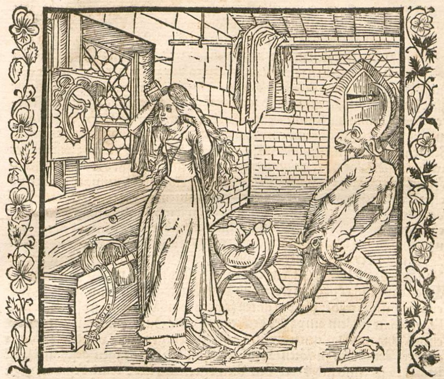 (Lorenzo Pignotti, traduction anonyme [M. de Traversay], in L’Esprit des journaux, français et étrangers, tome V, deuxième trimestre, mai 1806 [Bruxelles : De l’Imprimerie de Weissenbruch] ; repris dans les Archives littéraires de l’Europe ou mélanges de littérature, d’histoire et de philosophie, tome neuvième, n° 25, Paris/Turingue : Xhrouet, imprimeur du Publiciste/Cotta, 1806, puis dans Le Nouvelliste français ou recueil choisi de mémoires, itinéraires, réflexions morales et critiques, etc., rédigé par Henry et Richard, tome sixième, livraison XXI, Pesth : Conrade Adolphe Hartleben, libraire, 1815. Gravure d’Albrecht Dürer, in Geoffroy de la Tour Landry, Der Ritter vom Turn, traduit par Marquart [von Stein], Bâle : 1493)