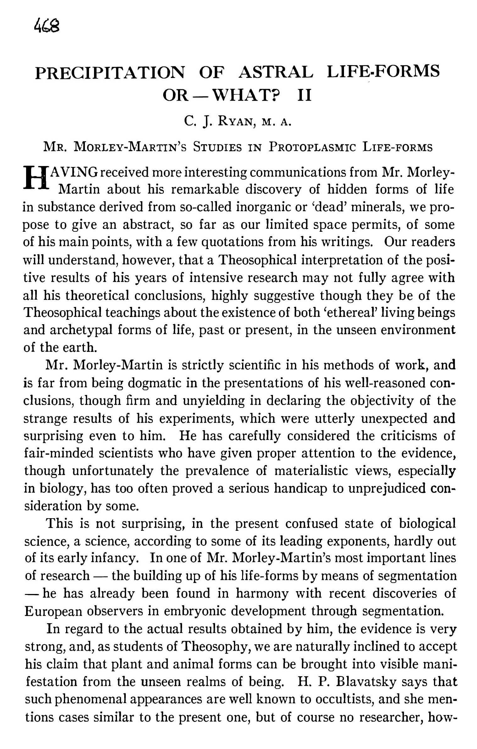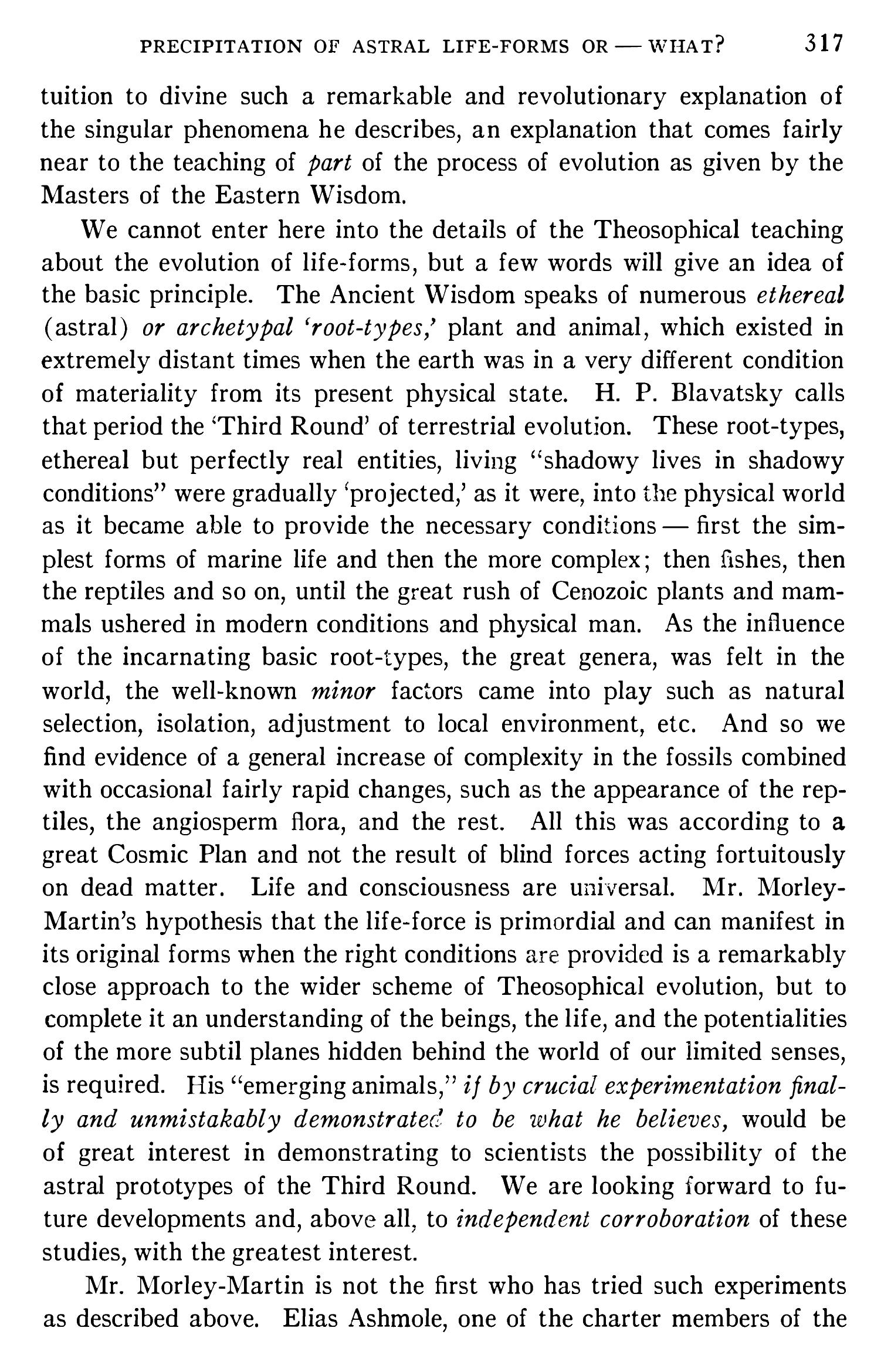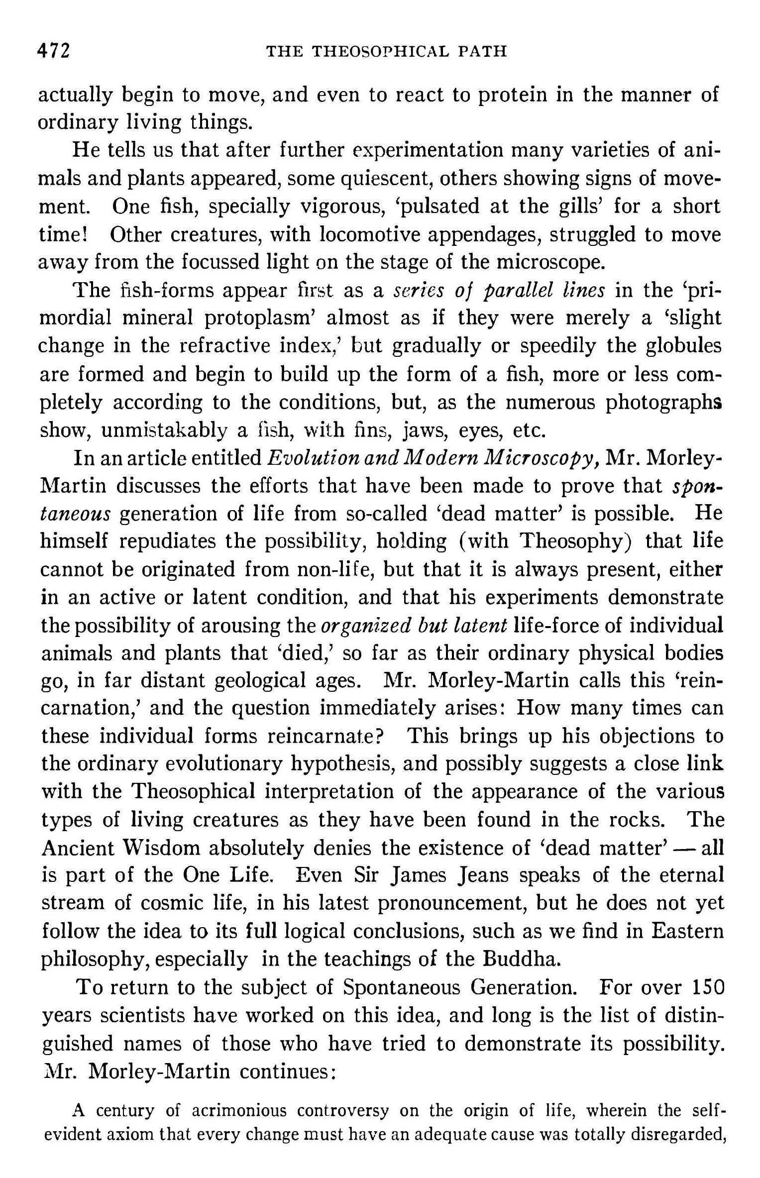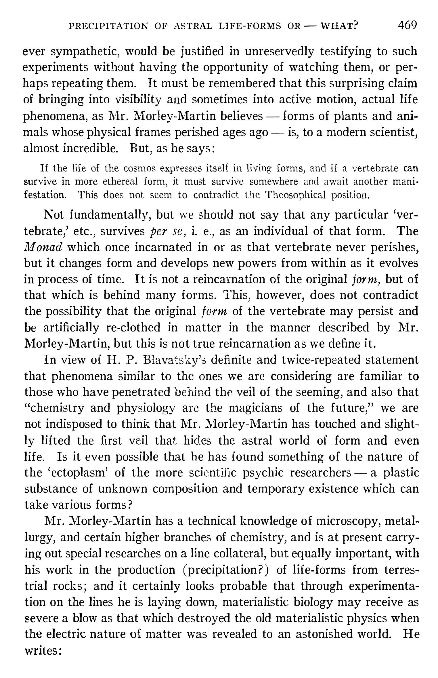 Selon Morley Martin, les formes qu’il arrache à leur sommeil immémorial sont les réincarnations d’une force spécifique, déterminée et éternelle. La vie n’est pas une expression des forces du corps ; le corps est l’expression de la force vitale préexistante et indestructible. Il pense que les vertébrés existaient sur notre planète avant (?) qu’il n’y eût terres ou mers. Il ne dit pas comme Thomas Huxley que le protoplasme est la base physique de la vie, mais la base physique pour la vie. Ce protoplasme est ce qui peut perpétuer sa vie physique. L’animal perd son corps, mais ne perd pas la vie. Il n’est rien d’inanimé. Aucune forme de vie n’est éteinte. Rien ne meurt et l’identité de la vie animale survit même après assimilation dans une plante où elle peut être réveillée. Le contraire de la vie n’est pas la mort, mais la latence. L’homme est latent dans le roc.