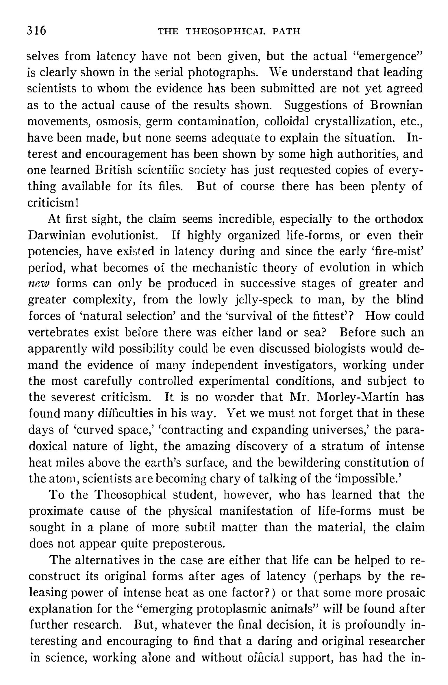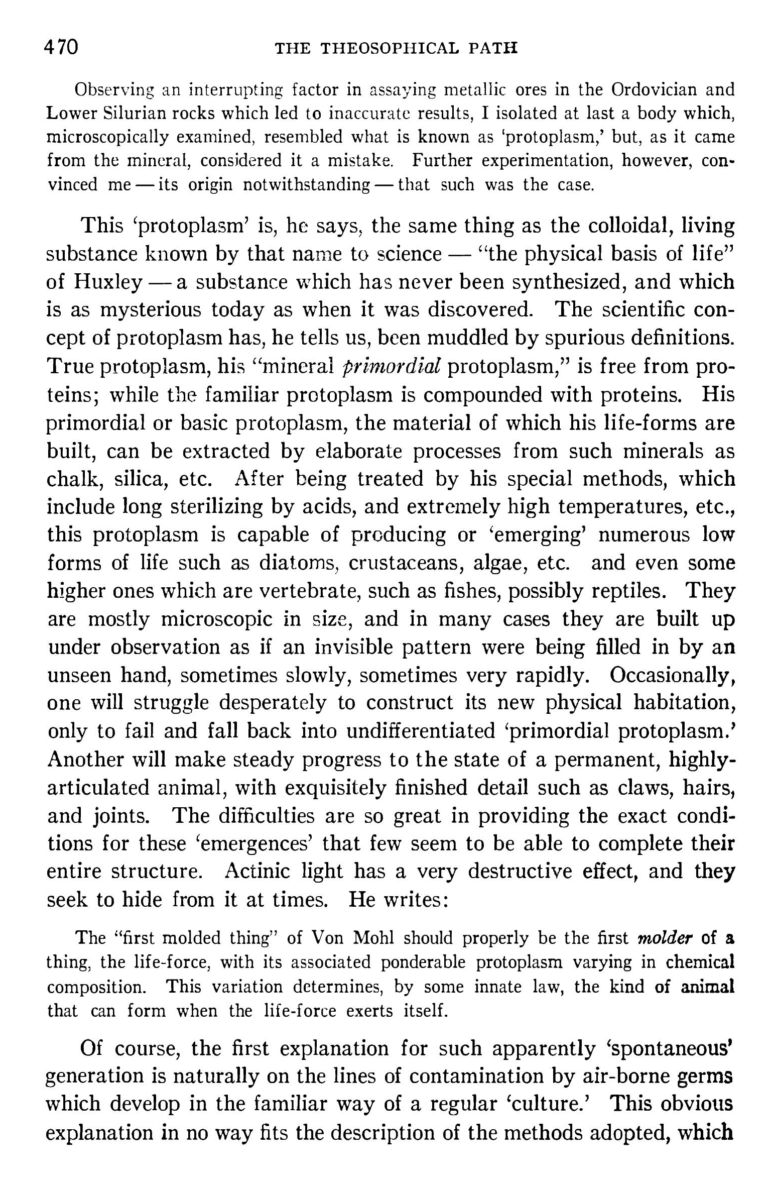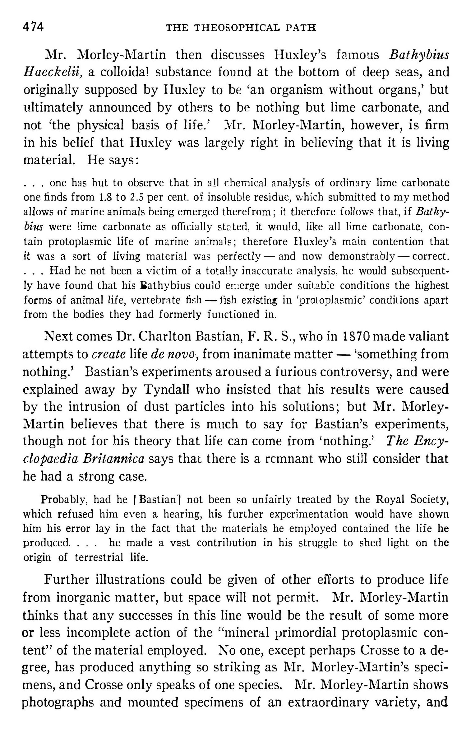 Ses premières découvertes sur la vie organique ne tardèrent pas à être relayées par une série d’articles de la Société de Théosophie, qui lui valurent une notoriété éphémère, tout en contribuant surtout à discréditer ses travaux auprès du monde scientifique.
