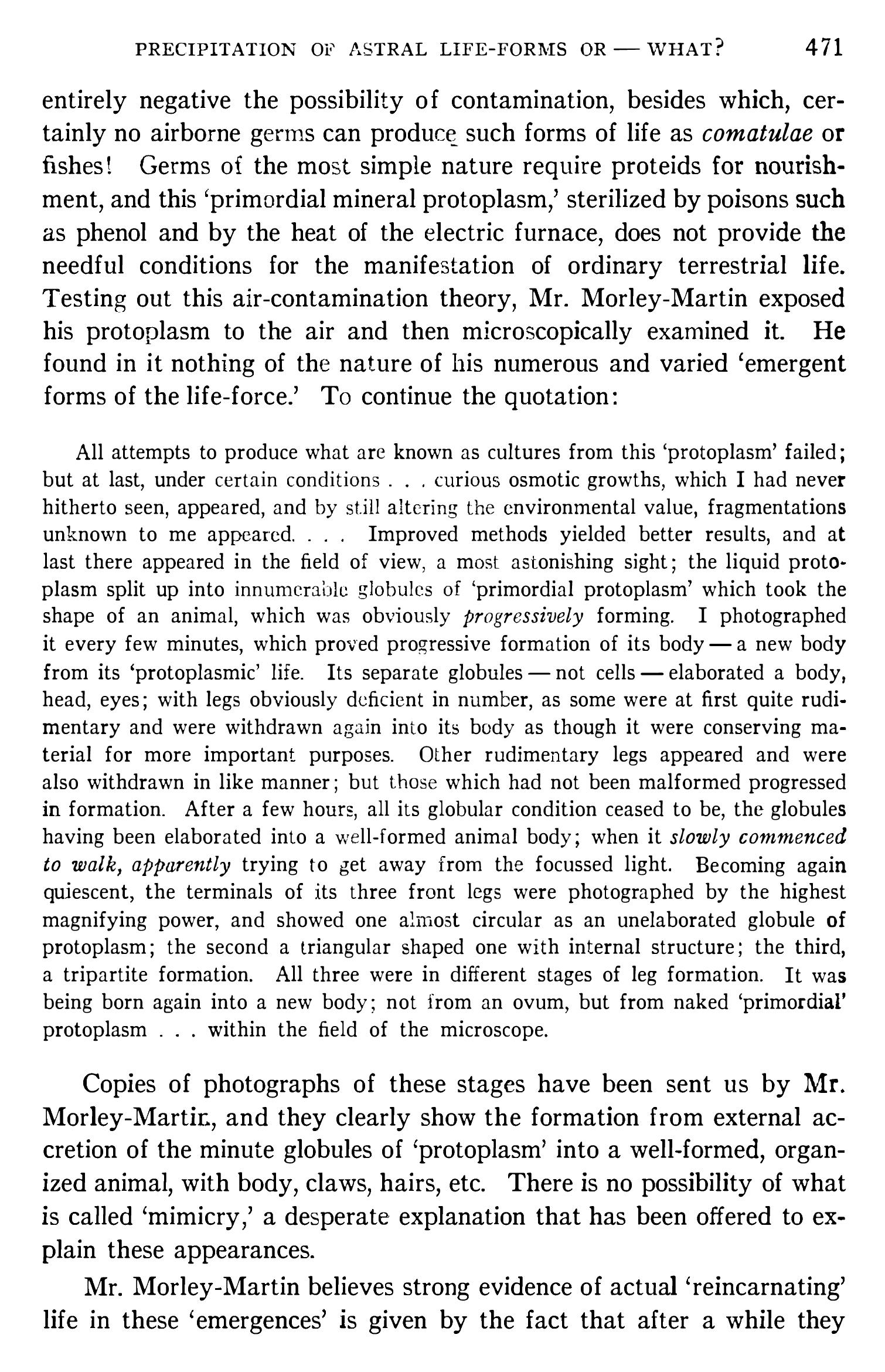 L’examen de ces séries de microphotographies fixant les différentes stages de cette vie protoplasmique renaissante est une des plus grandes merveilles qu’il m’ait jamais été donné de contempler. Sans qualité pour apprécier les travaux de M. Morley Martin, sans pouvoir assurer s’il s’agit bien là d’une réincarnation grâce un germe imputrescible retrouvé dans les flancs de la terre, je ne crois pas trop m’avancer en disant qu’il peut fort bien s’agir d’une découverte véritablement sensationnelle.