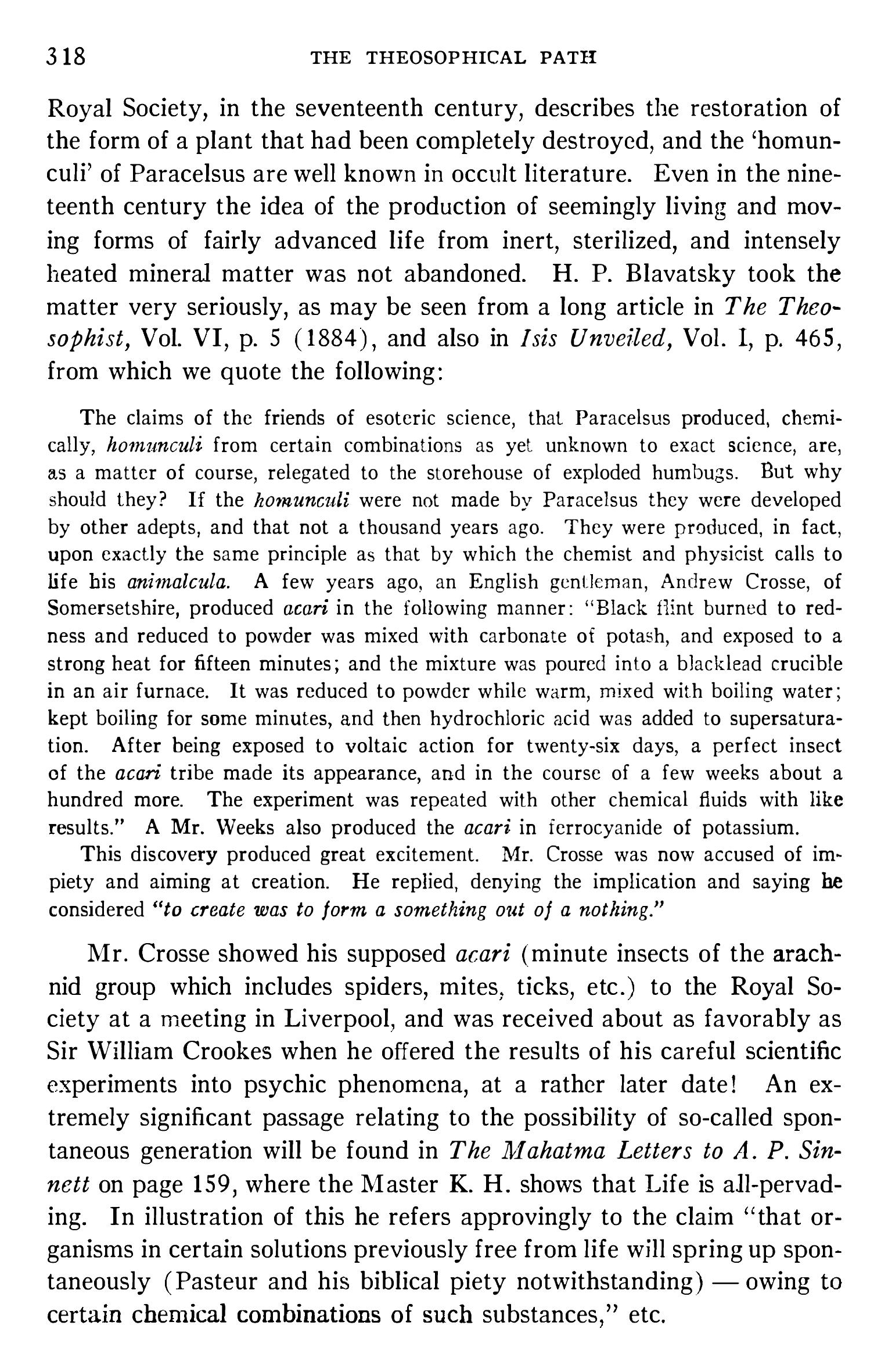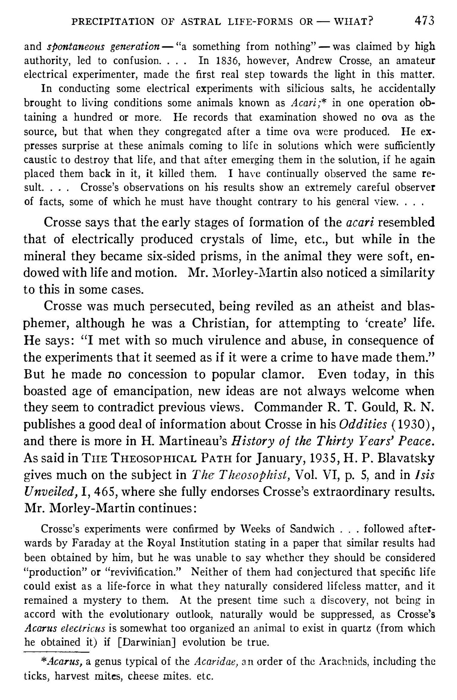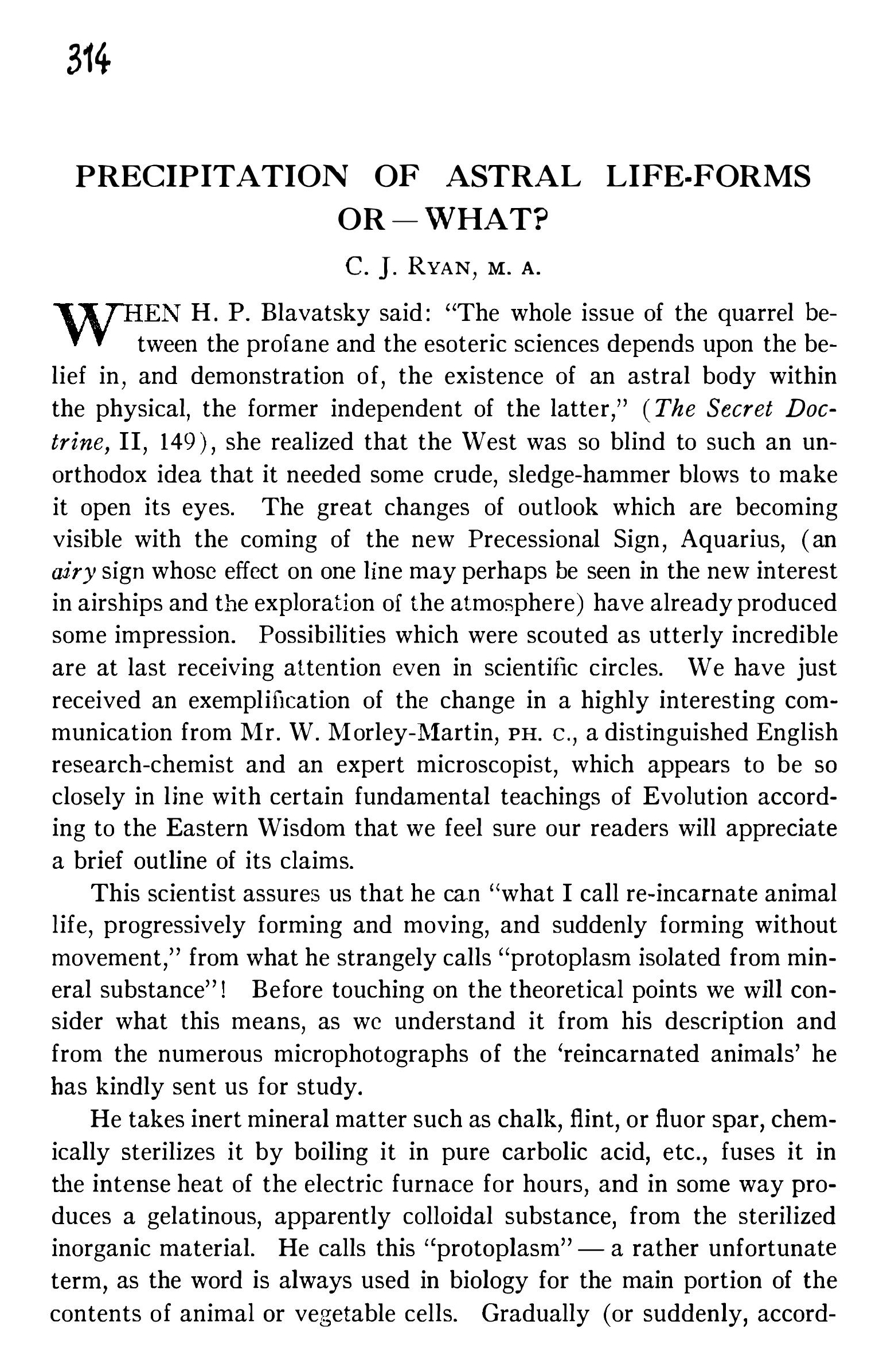 (1) Il s’agit de The Reincarnation of Animal and Plant Life from Protoplasm Isolated from the Mineral Kingdom [La Réincarnation de la vie animale et végétale à partir du protoplasma extrait du règne minéral], 1934. Cette brochure à compte d’auteur, éditée à petit nombre, est aujourd’hui rarissime. [note de Monsieur N]