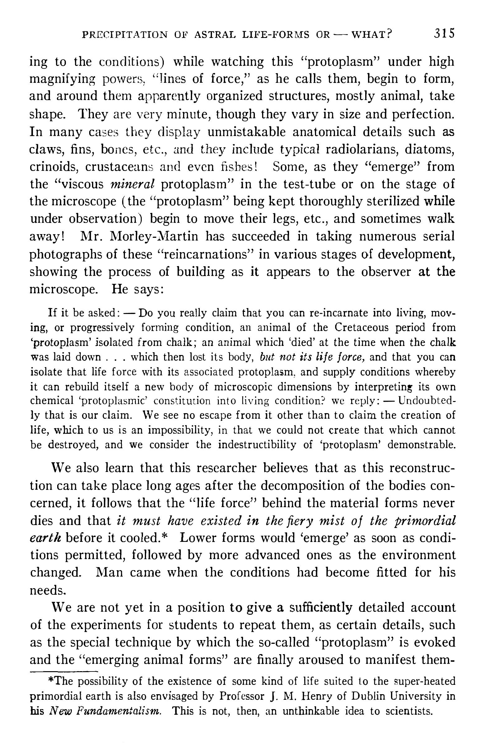 « C’est une grave erreur de penser que la vie est un état du corps. Bien au contraire, le corps est un des états de la vie parce que le protoplasma, substance qui constitue la cellule vivante, est une chose éternelle, indestructible, dont le temps ni même le feu ne peuvent avoir raison. C’est pourquoi je ne veux pas que l’on dise que je crée la vie. Je réincarne, ce qui est tout à fait différent, en me servant, comme base pour mes travaux, du protoplasma que, par des procédés chimiques qui me sont personnels, j’extrais de divers minéraux, tels que la craie ou les roches calcaires, la poussière d’éponge ou encore l’huile de foie de morue. Et c’est en travaillant ce protoplasma que je suis parvenu, après des expériences innombrables, à produire des formations de la vie dont voici des exemples. »