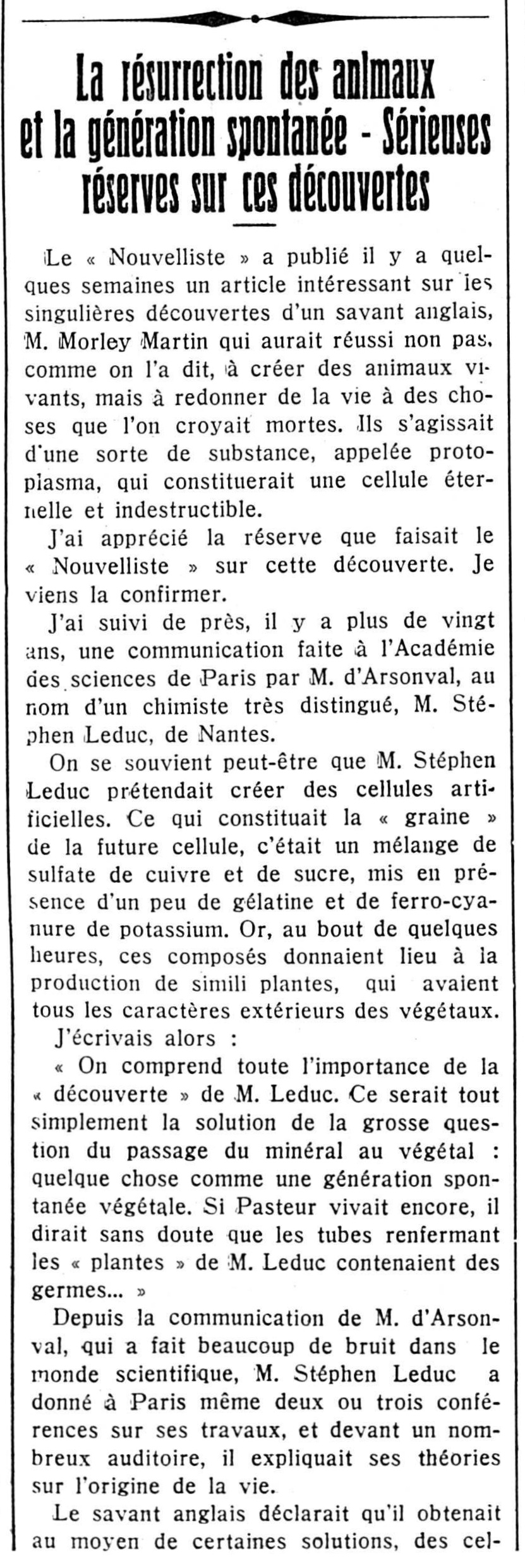 Ainsi, par un procédé dont il garde jalousement le secret, M. Morley Martin aurait réveillé la vie à l’état latent et lui aurait rendu un corps terrestre.