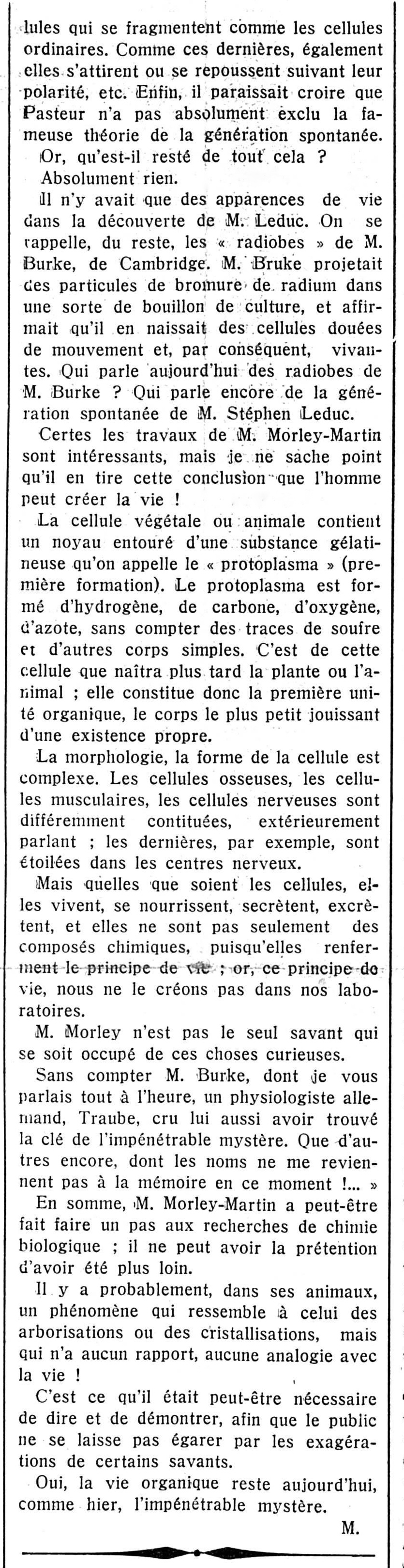L’an dernier mourait à South Harrow, faubourg de Londres, un chimiste biologiste, nommé Morley Martin, qui fit à Andover, petite ville de cinq à six mille habitants, dans le Hampshire, la plus extraordinaire découverte que la science ait eu à enregistrer depuis la gravitation de Newton et l’invention du radium.