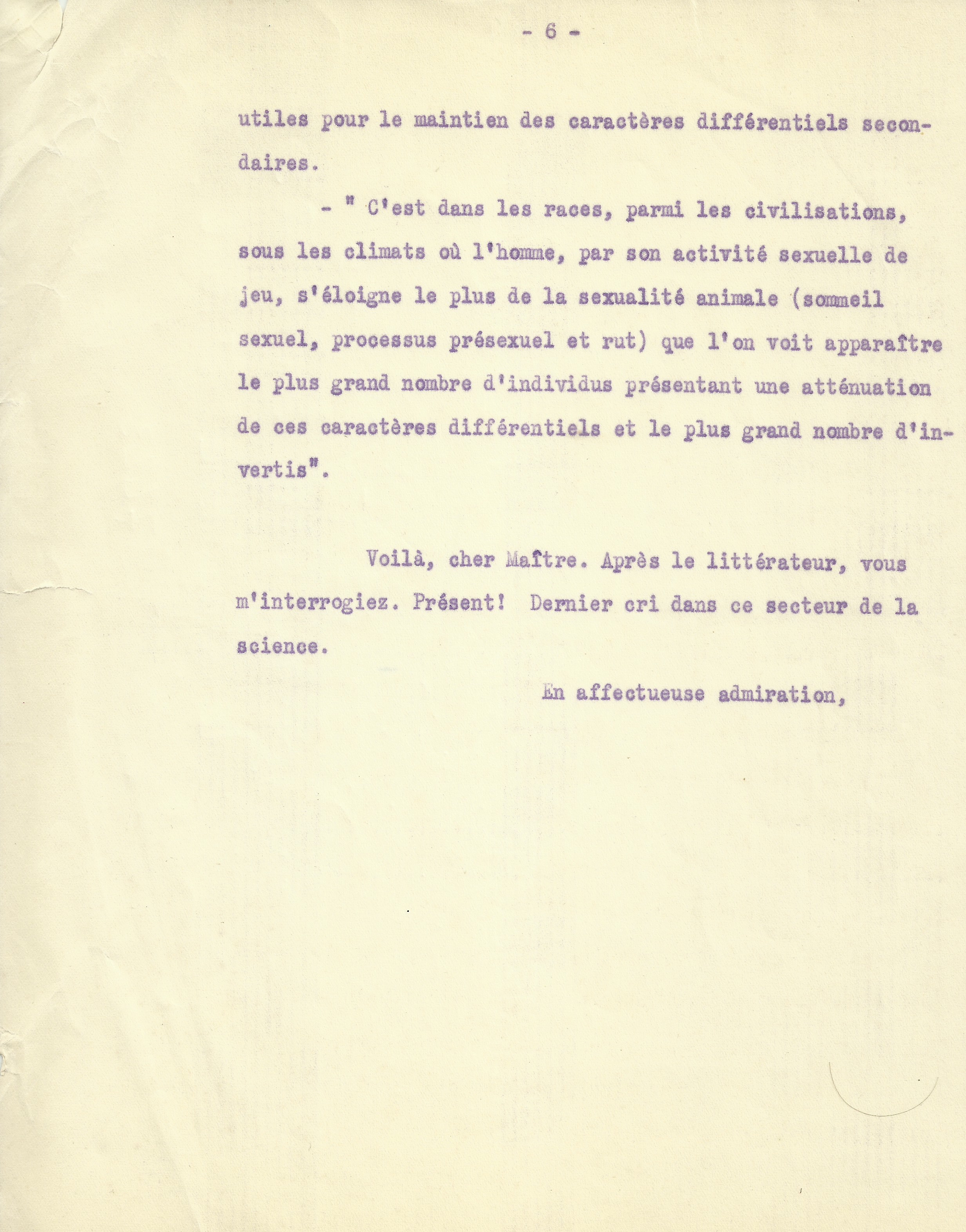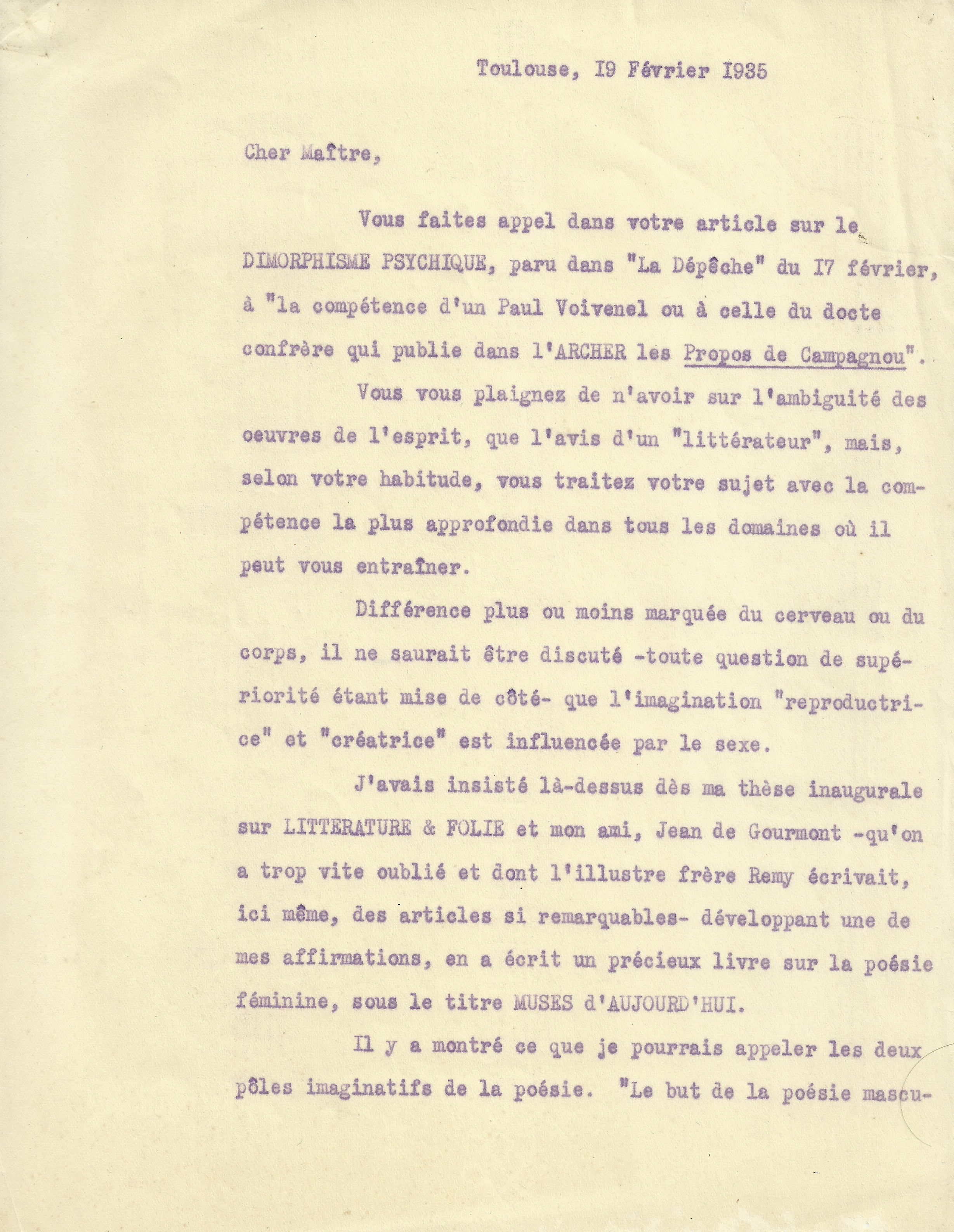 Nous reproduisons ci-dessous la réponse tapuscrite de Paul Voivenel à l’article d’Edmond Haraucourt. Rappelons que le Docteur Voivenel, neuropsychiatre et écrivain, était rédacteur en chef de la revue L’Archer et auteur des « Propos de Campagnou, » mentionnés dans l’article d’Haraucourt.