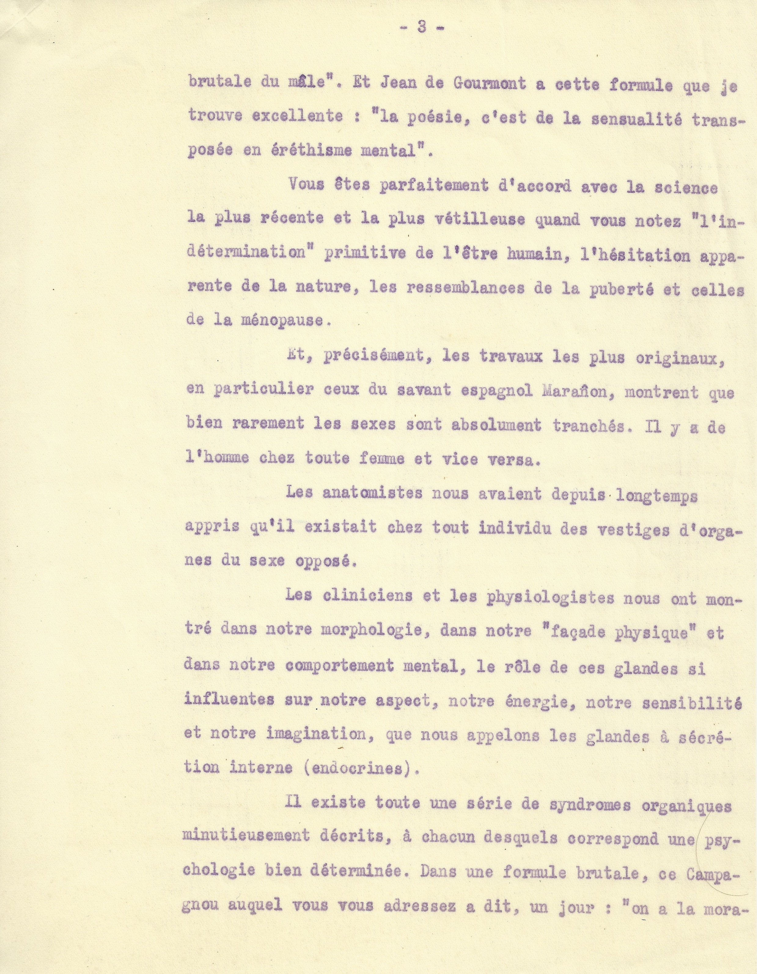 Il y a plus. En l’état actuel de la science, une théorie assez neuve tend à s’accréditer, d’après laquelle la différenciation des sexes serait, dans la réalité physiologique, beaucoup moins nette et moins complète qu’elle n’apparaît sur les registres de l’état civil. Ceux-ci affirment, sans hésitation ni réserve d’aucune sorte, que, tel jour, est né tel individu appartenant au sexe masculin ou bien au sexe féminin. Jamais il ne s’avisent d’indiquer que les caractéristiques secondaires de la sexualité puissent être imprécises chez tel ou tel enfant ; ils se contentent d’enregistrer l’essentiel, et c’est fort heureux. Mais, plus tard, quand l’échappé du berceau aura parachevé sa formation, certains spécialistes remarqueront que cet adolescent n’est pas intégralement un mâle, que cette adulte n’est pas absolument une femelle : le développement excessif de tel organe ou la singulière atrophie de tel autre, l’armature du bassin, la cambrure des reins, le grain de la peau ou la pilosité, le timbre de la voix, etc., révèlent en ce garçon des tendances à être une fille, en cette dame un regret de n’être pas homme.