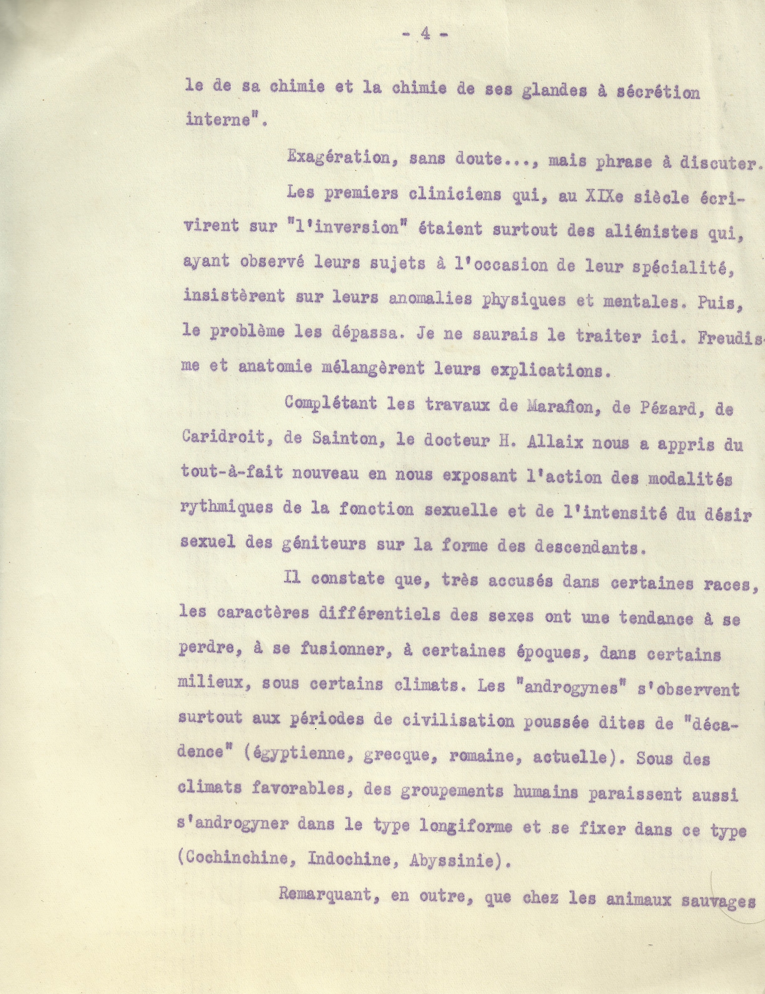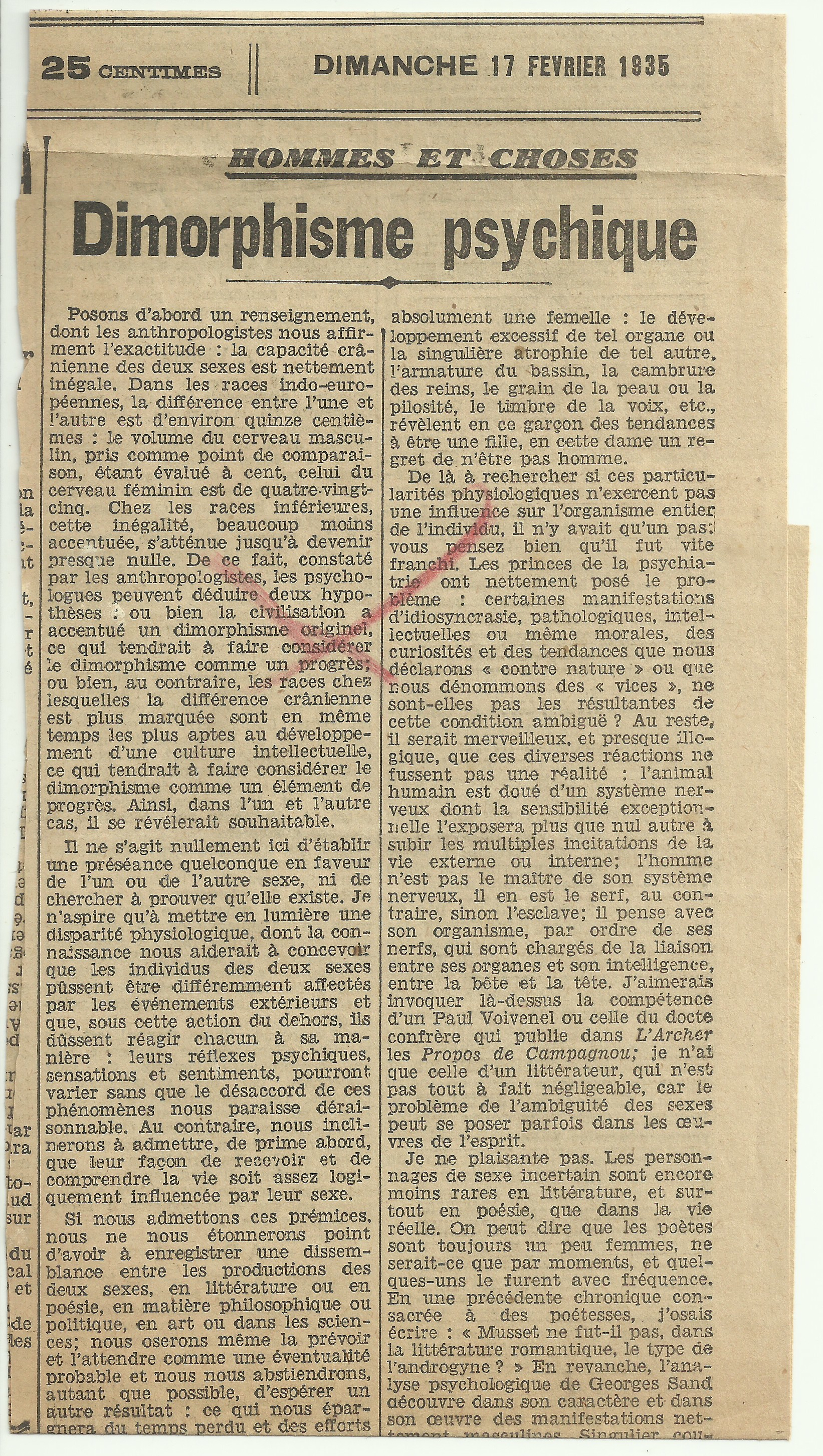 De là à rechercher si ces particularités physiologiques n’exercent pas une influence sur l’organisme entier de l’individu, il n’y avait qu’un pas ; vous pensez bien qu’il fut vite franchi. Les princes de la psychiatrie ont nettement posé le problème : certaines manifestations d’idiosyncrasie, pathologiques, intellectuelles ou même morales, des curiosités et des tendances que nous déclarons « contre nature » ou que nous dénommons des « vices, » ne sont-elles pas les résultantes de cette condition ambiguë ? Au reste, il serait merveilleux, et presque illogique, que ces diverses réactions ne fussent pas une réalité : l’animal humain est doué d’un système nerveux dont la sensibilité exceptionnelle l’exposera plus que nul autre à saisir les multiples incitations de la vie externe ou interne ; l’homme n’est pas le maître de son système nerveux, il en est le serf, au contraire, sinon l’esclave ; il pense avec son organisme, par ordre de ses nerfs, qui sont chargés de la liaison entre ses organes et son intelligence, entre la bête et la tête. J’aimerais invoquer là-dessus la compétence d’un Paul Voivenel ou celle du docte confrère qui publie dans L’Archer les Propos de Campagnou ; je n’ai que celle d’un littérateur, qui n’est pas tout à fait négligeable, car le problème de l’ambiguïté des sexes peut se poser parfois dans les œuvres de l’esprit.