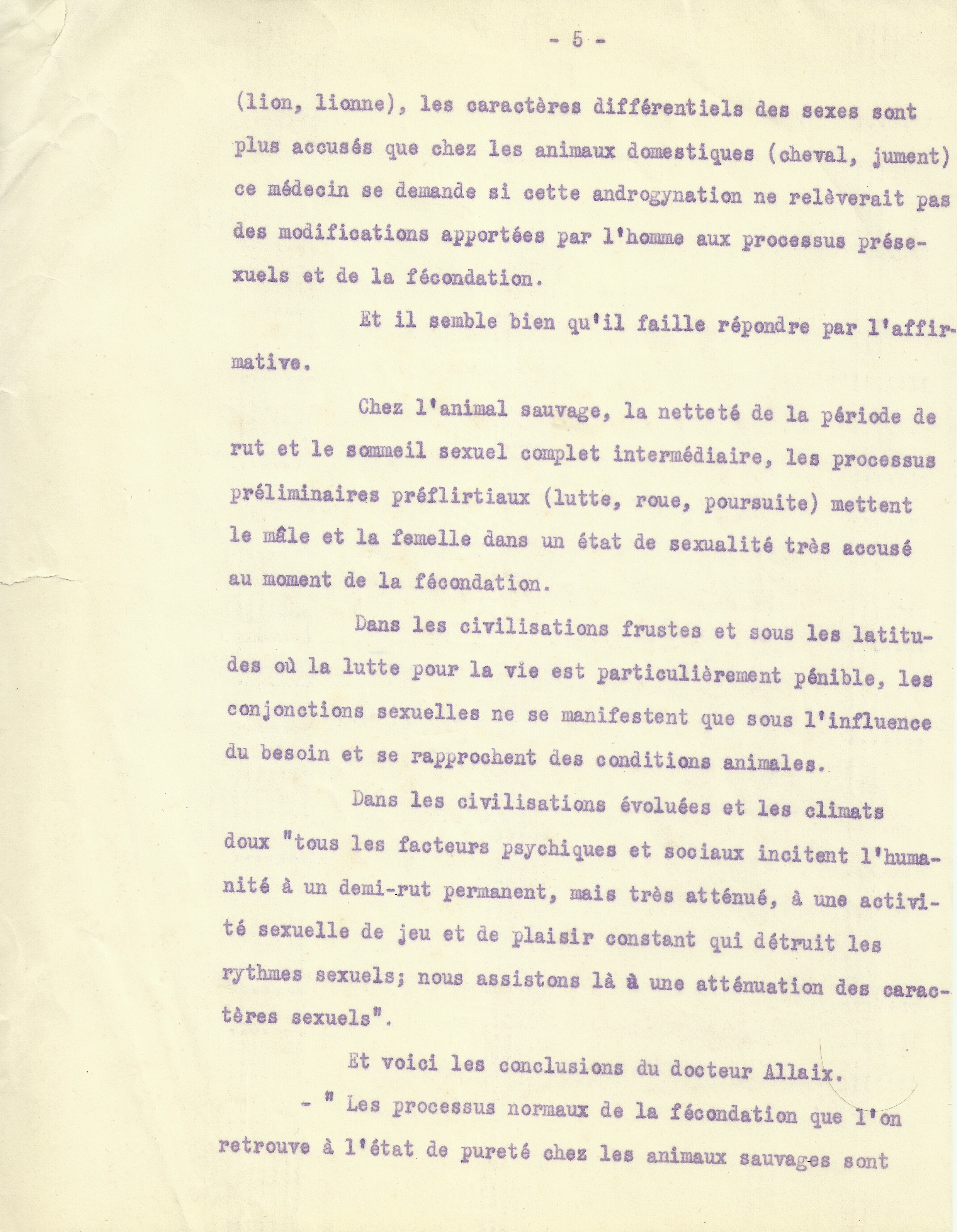 Il ne s’agit nullement ici d’établir une préséance quelconque en faveur de l’un ou de l’autre sexe, ni de chercher à prouver qu’elle existe. Je n’aspire qu’à mettre en lumière une disparité physiologique, dont la connaissance nous aiderait à concevoir que les individus des deux sexes pussent être différemment affectés par les événements extérieurs et que, sous cette action du dehors, ils dussent réagir chacun à sa manière : leurs réflexes psychiques, sensations et sentiments, pourront varier sans que le désaccord de ces phénomènes nous paraisse déraisonnable. Au contraire, nous inclinerons à admettre, de prime abord, que leur façon de recevoir et de comprendre la vie soit assez logiquement influencée par leur sexe.