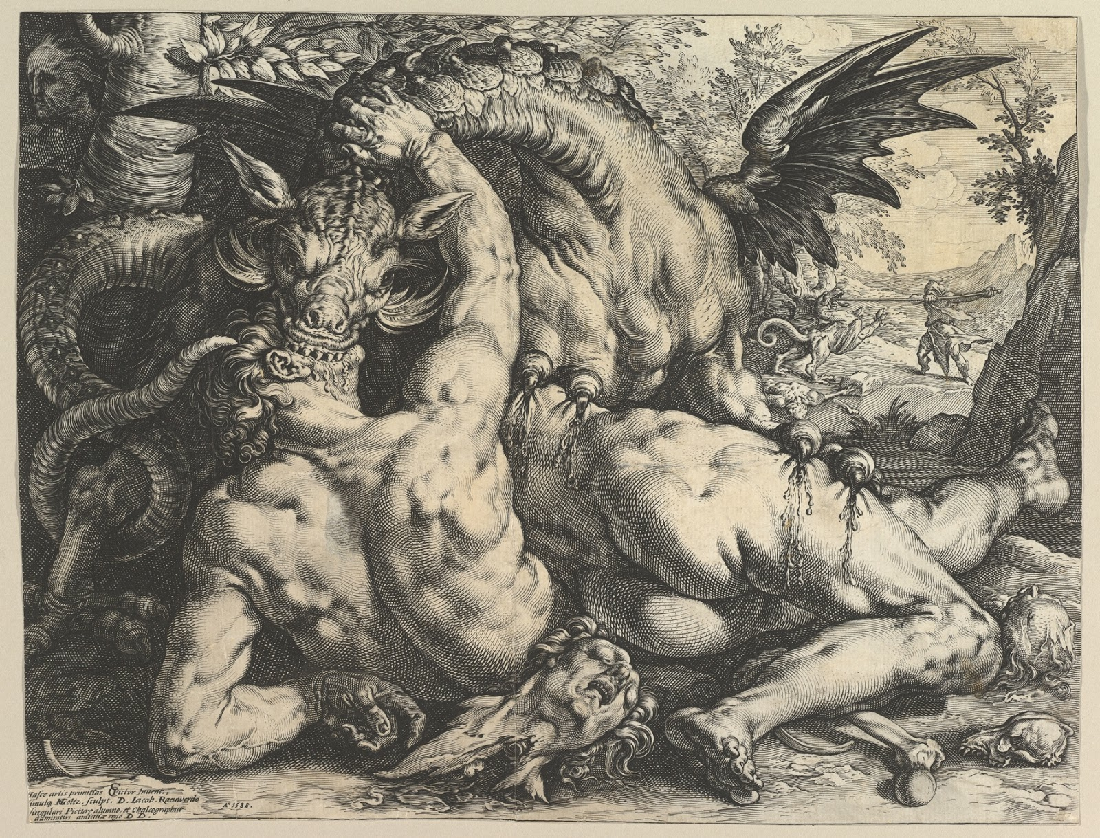 Hendrik Goltzius, « Le Dragon dévorant les compagnons de Cadmos, » gravure sur cuivre, 1588 ; « Cadmos tuant le dragon, » huile sur toile, 1573-1617