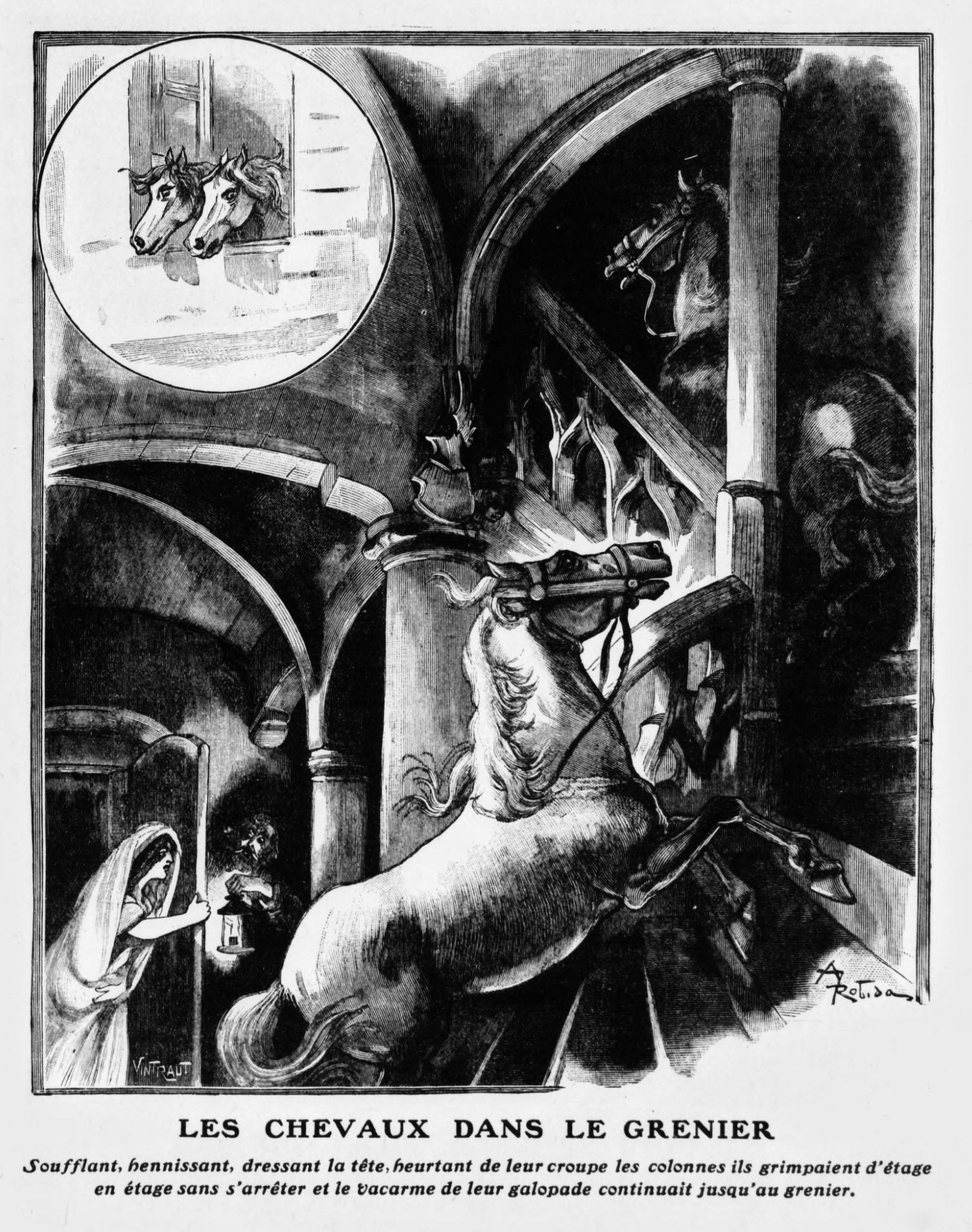Soufflant, hennissant, dressant la tête, heurtant de leur croupe les colonnes, ils grimpaient d’étage en étage sans s’arrêter, et le vacarme de leur galopade continuait jusqu’au grenier dont ils enfoncèrent la porte, et là, mettant la tête à la lucarne, ils réveillaient la rue par leurs hennissements.