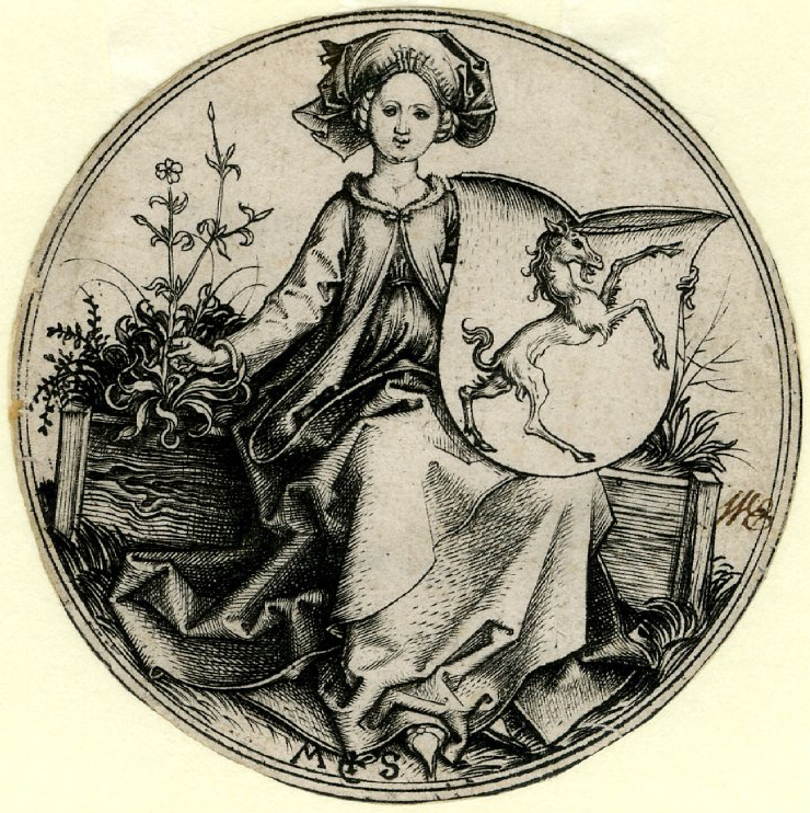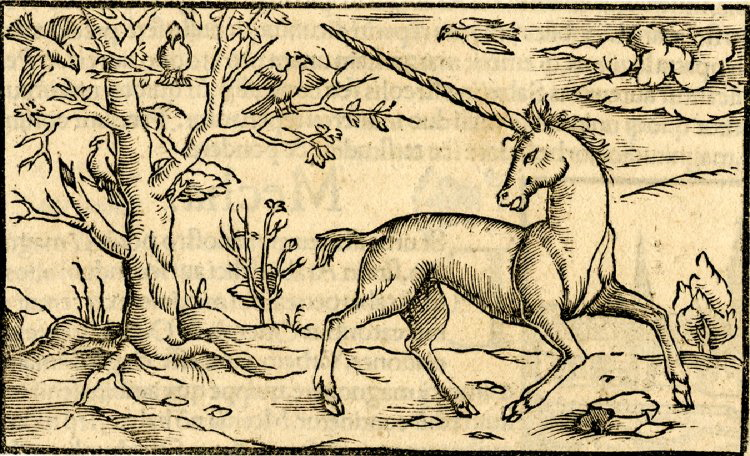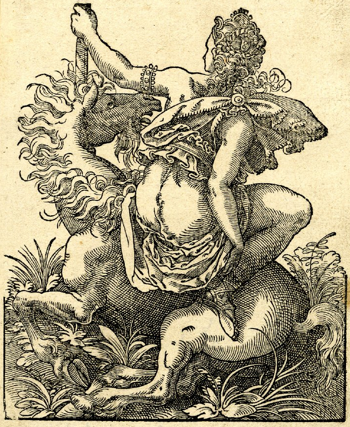 (J.-A. Barbier-Daumont, Le Capteur d’âmes, roman d’aventures diaboliques, première partie, in L’Homme libre, 22, 23 et 24 février 1933 ; édition en volume : Le Capteur d’âmes, roman fabuleux, Paris : Société d’Édition et de diffusion littéraire, 1947. Jost Amman, « Nymphe chevauchant une licorne, » Enchiridion Artis, gravure sur bois, 1578 ; M. S., « Blason à la licorne, » 1469-1482 ; gravure sur bois illustrant la Cosmographia Universalis de Sebastian Münster, c. 1544-52)