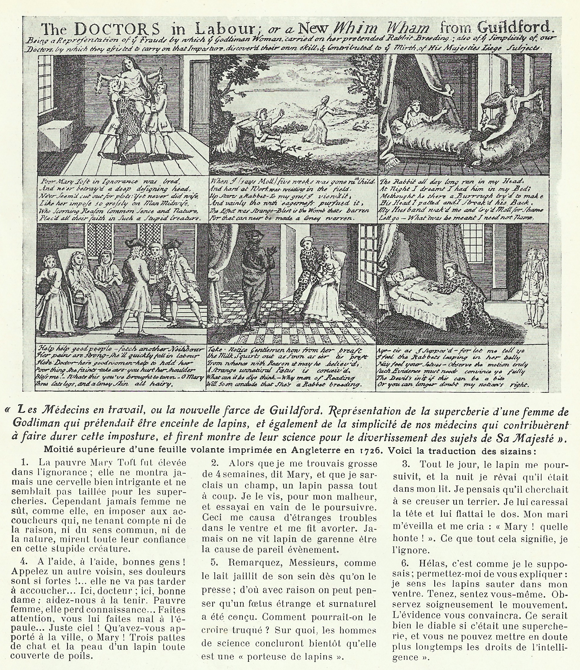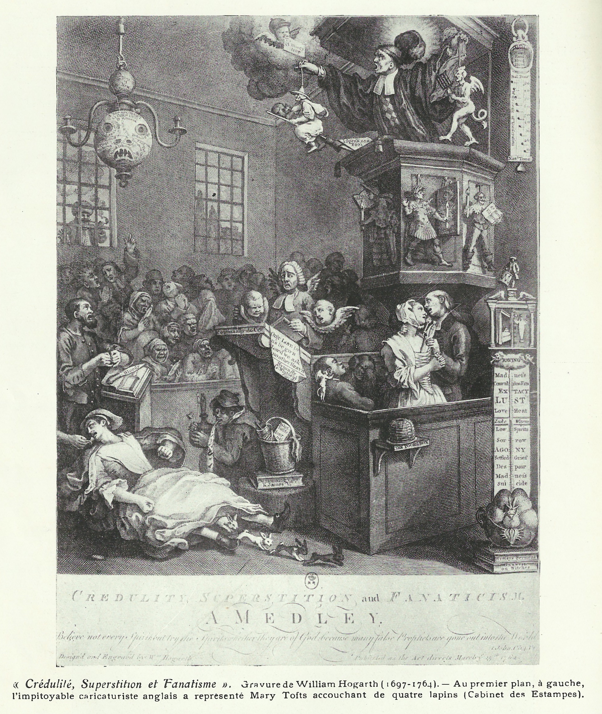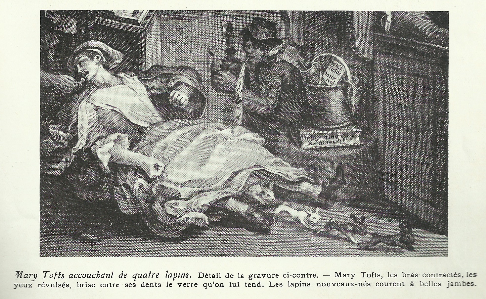 Sur l’histoire de Mary Toft(s), et plus particulièrement sur l’interprétation des gravures de William Hogarth, je renvoie les lecteurs à l’excellent article que leur consacre Rémy Leboissetier, sur son blog du Lièvre Lunaire : « Cunicularii ou les Sages de Godliman en mission d’étude. »