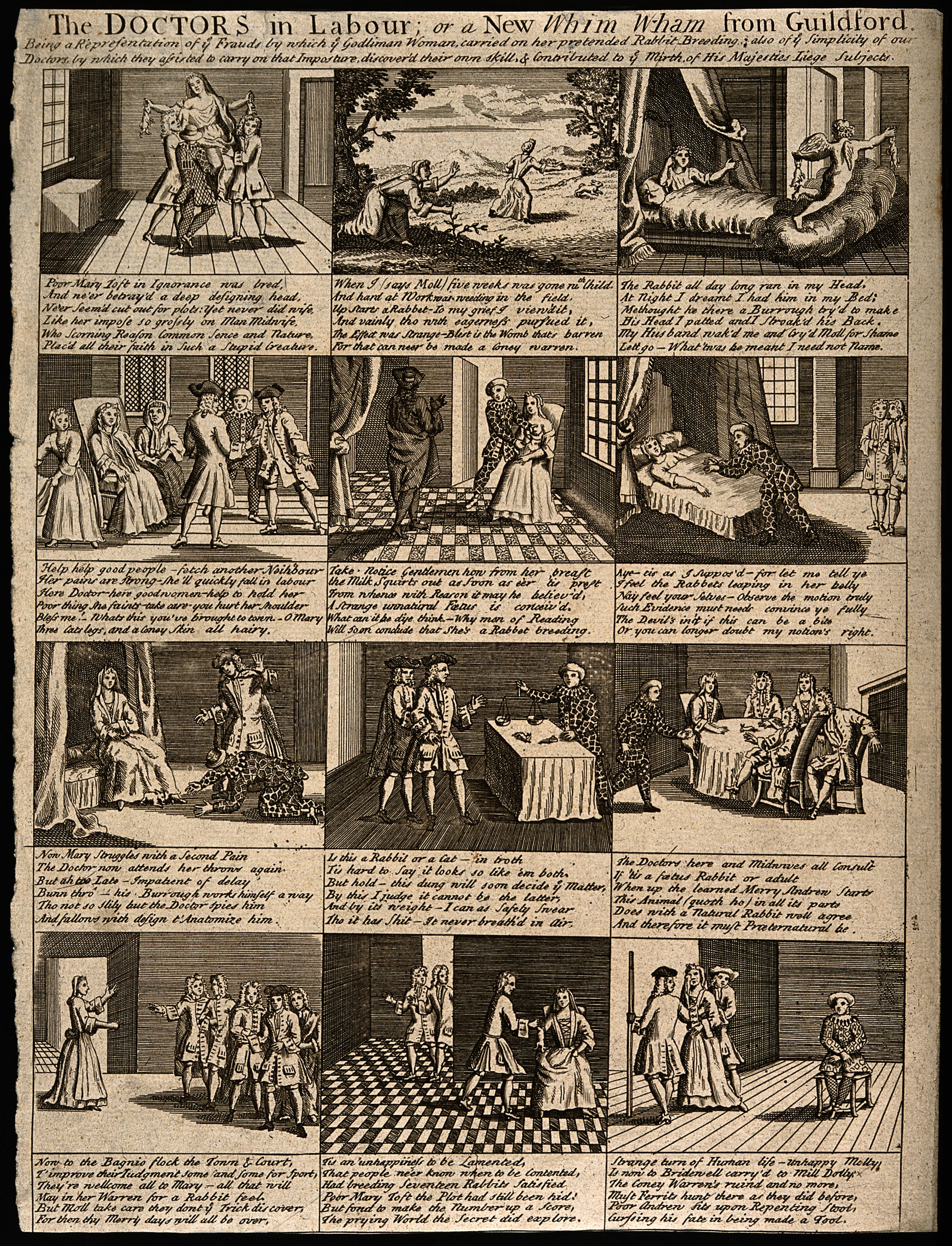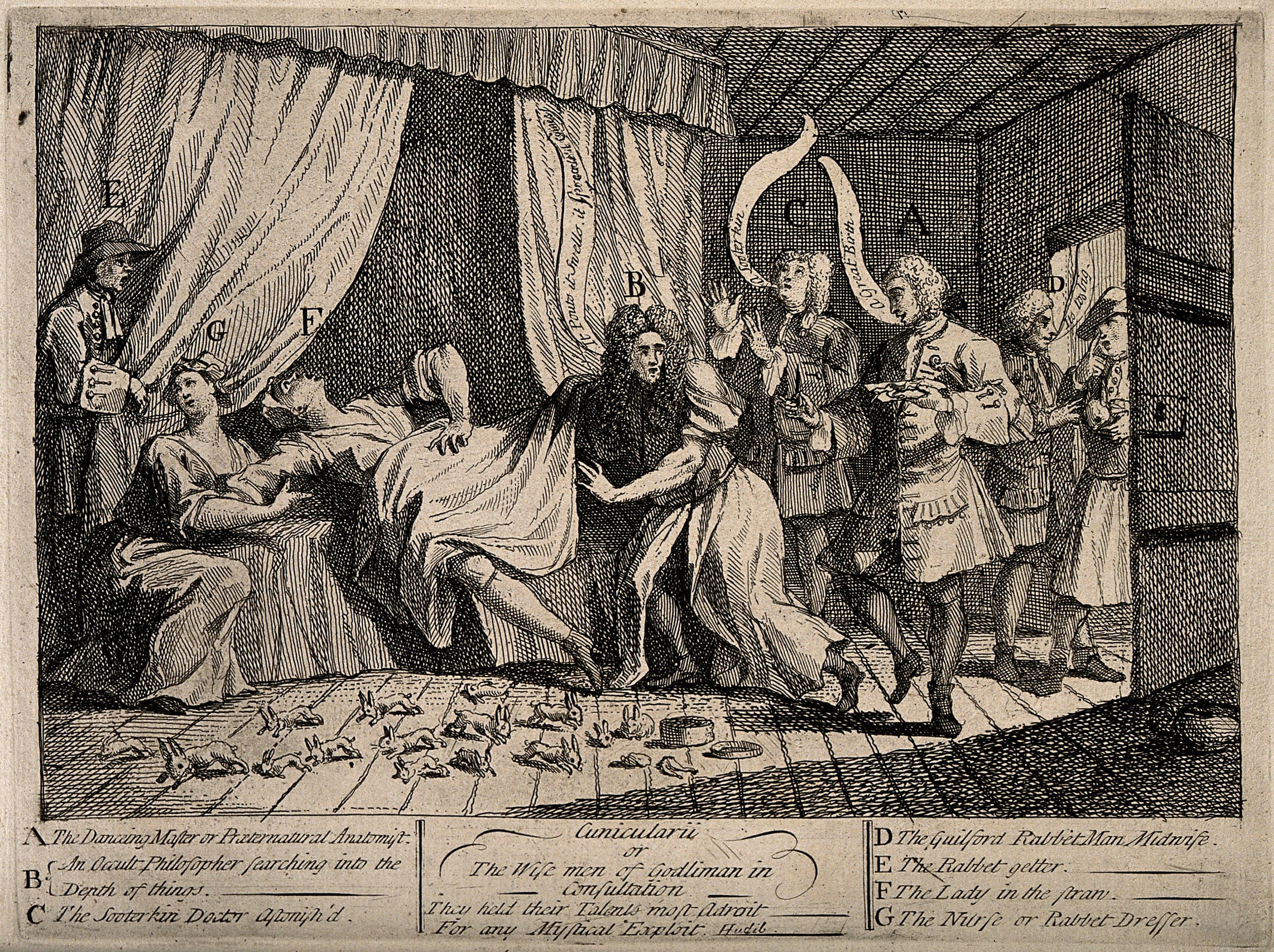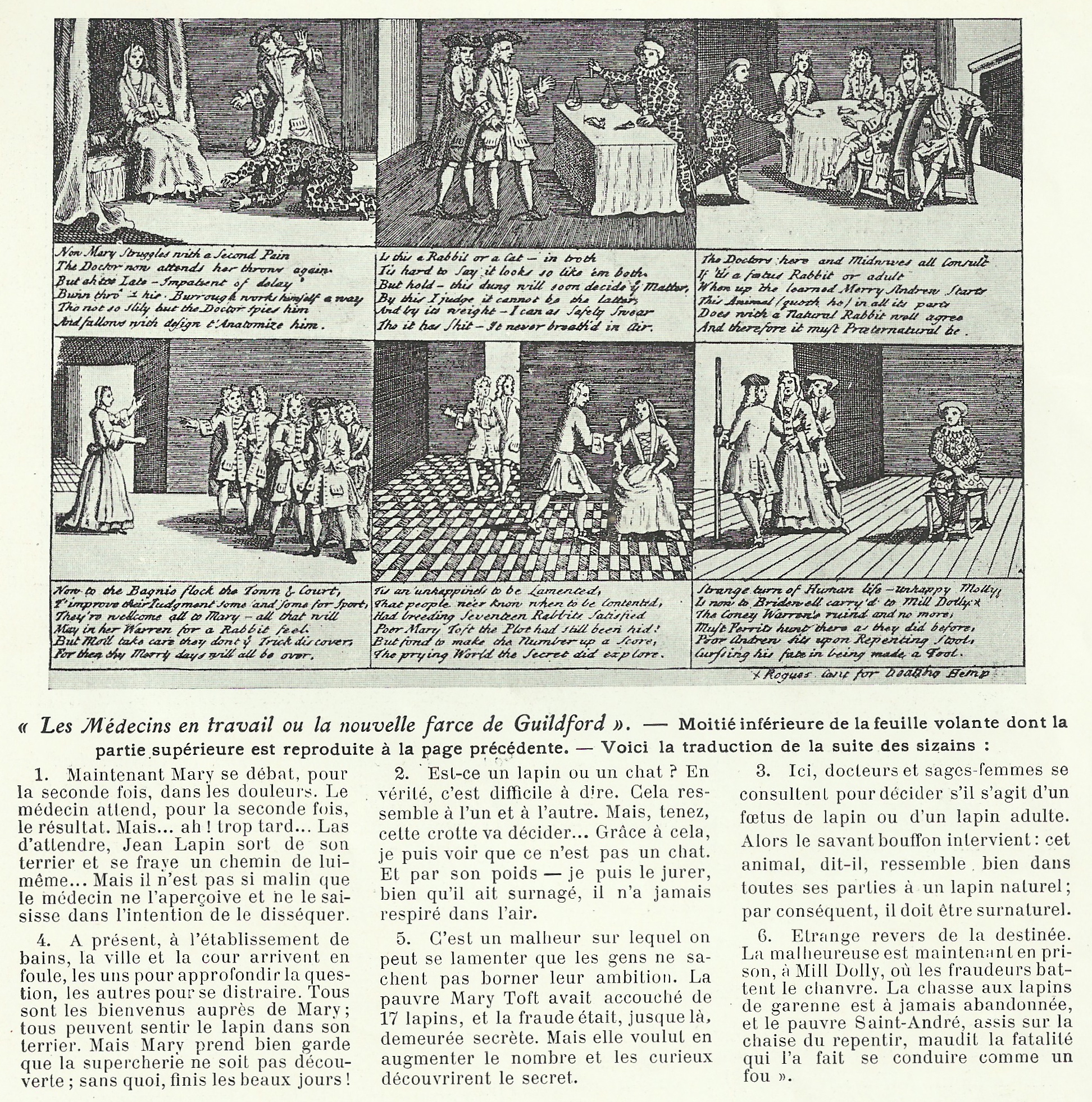 Sur l’histoire de Mary Toft(s), et plus particulièrement sur l’interprétation des gravures de William Hogarth, je renvoie les lecteurs à l’excellent article que leur consacre Rémy Leboissetier, sur son blog du Lièvre Lunaire : « Cunicularii ou les Sages de Godliman en mission d’étude. »