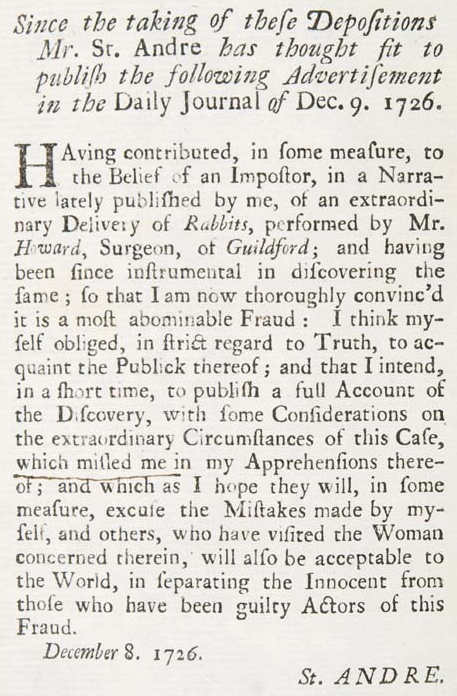 « Ayant contribué en quelque manière à la croyance d’une imposure, par le narré que j’ai publié depuis peu d’un accouchement extraordinaire de lapins fait par le sieur Howard, chirurgien de Guilford, et ayant été depuis employé dans la découverte d’icelle, en sorte que je suis présentement convaincu que c’est une très abominable fraude, je me crois obligé par un pur égard pour la vérité d’en informer le public, et de l’avertir que j’ai dessein de publier dans peu une ample relation de cette découverte, avec quelques considérations sur les circonstances extraordinaires de ce cas, lesquelles m’en ont fait avoir une fausse notion, et lesquelles doivent, comme je l’espère, excuser en quelque manière la bévue que j’ai faite moi-même et qu’ont faite plusieurs autres qui ont visité la femme en question. »