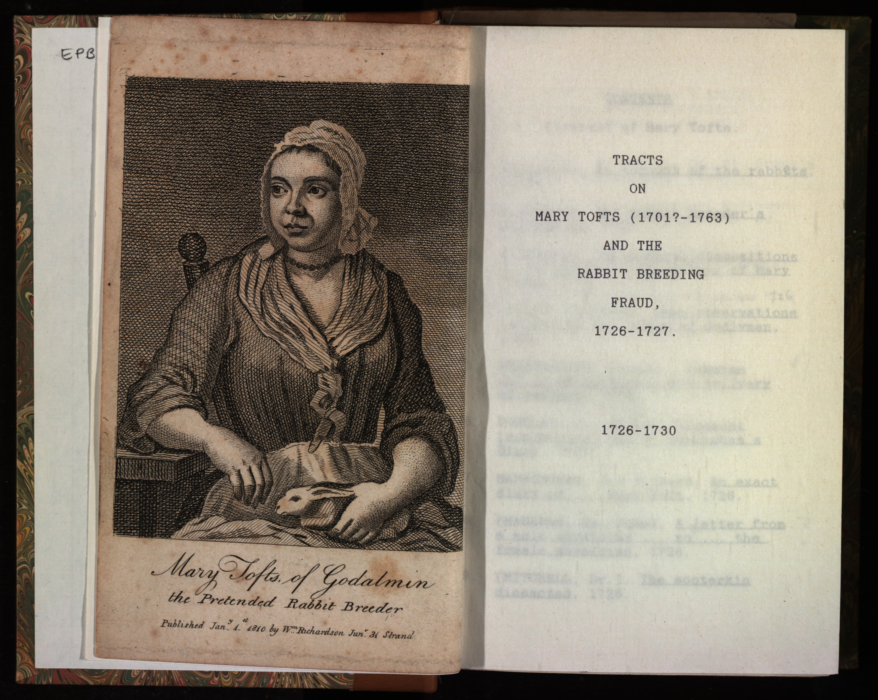 (3) An Exact Diary of what was observed during a close attendance upon Mary Toft, the pretended rabbit-breeder of Godalming in Surrey, from monday nov. 28 to wednesday dec. 7 following, together with an account of her confession of the fraud. By sir Richard Manningham, Kt Fellow of the Royal Society and the College of Physicians. London, 1726.