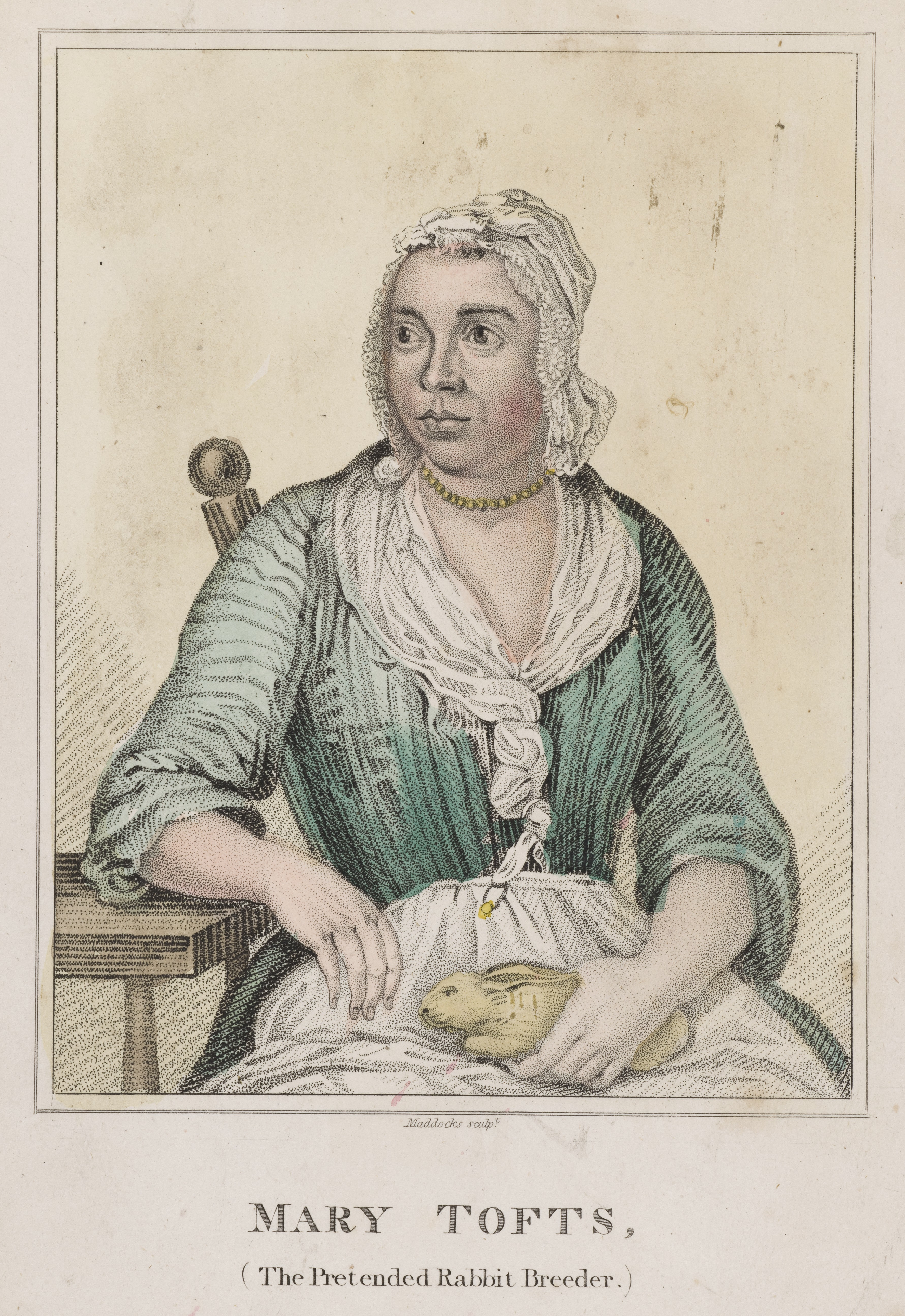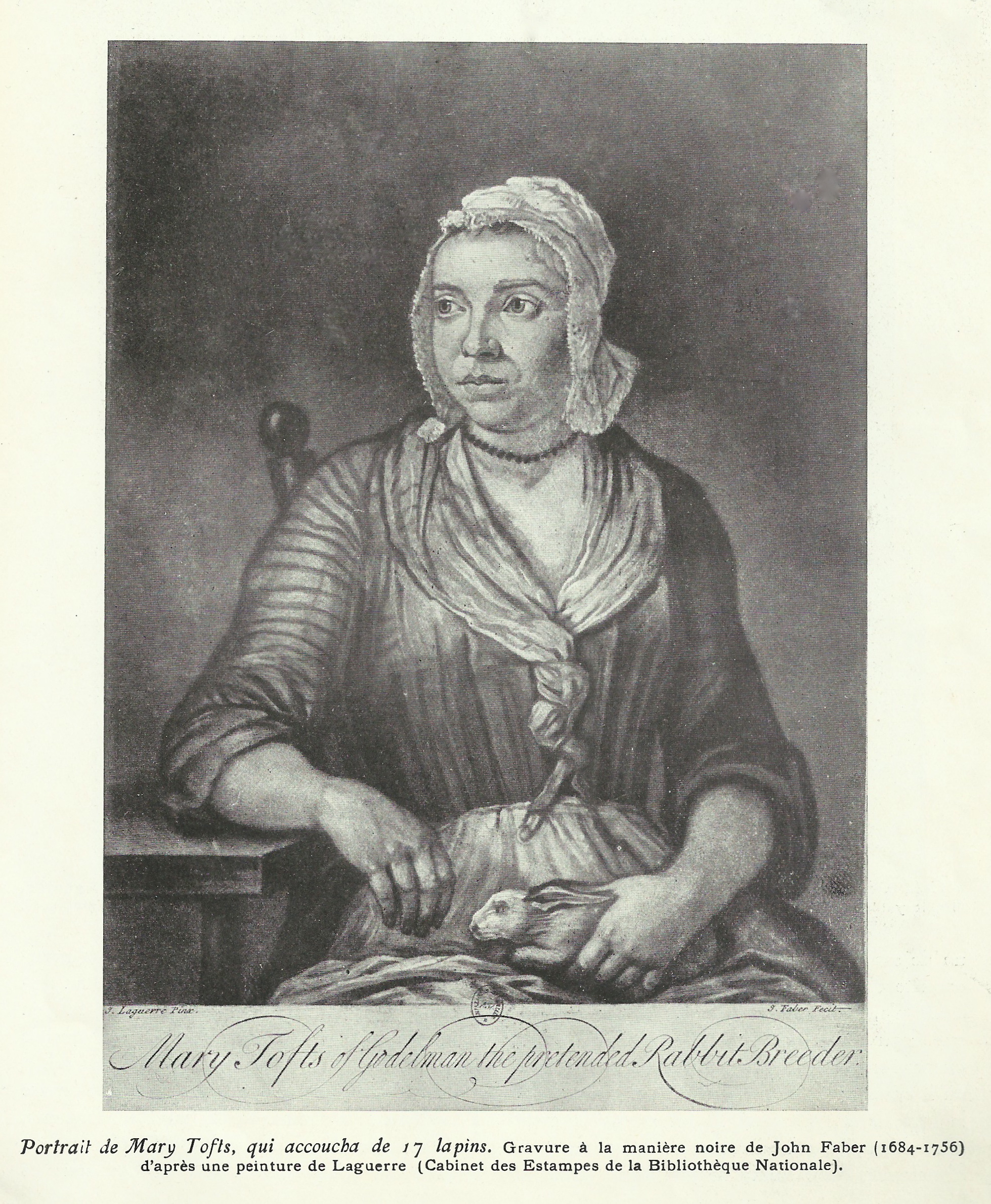 Après avoir questionné la femme, poursuit Saint-André, je sus qu’elle était née et avait été élevée à Godlyman. Elle était robuste, bien constituée et bien portante, mais stupide et triste de caractère. Elle avait épousé, il y a six ans, un certain Joshua Tofts, pauvre ouvrier drapier, de qui elle avait eu trois enfants. Elle raconte que le 23 avril dernier, comme elle était en train de sarcler un champ, elle vit un lapin sauter auprès d’elle. Elle était, croyait-elle, enceinte de quatre semaines, et cette vue lui donna envie de manger du lapin. Quelques instants plus tard, elle aperçut un second lapin qu’elle voulut attraper. La nuit, elle rêva de lapins. Depuis, elle eut constamment envie de manger du lapin ; mais, étant donné ses maigres ressources, ne put s’en procurer. Dix-sept semaines plus tard, elle fit une fausse couche. Trois semaines après, elle tomba malade et expulsa quelque chose qui ressemblait à du mou et à des boyaux de porc. M. Howard, quelques jours plus tard, la délivra de quelques parties d’un lapin. Au bout d’une quinzaine, elle fit ses relevailles et tout semblait fini lorsque M. Howard la délivra à nouveau de toute une série de lapins. »