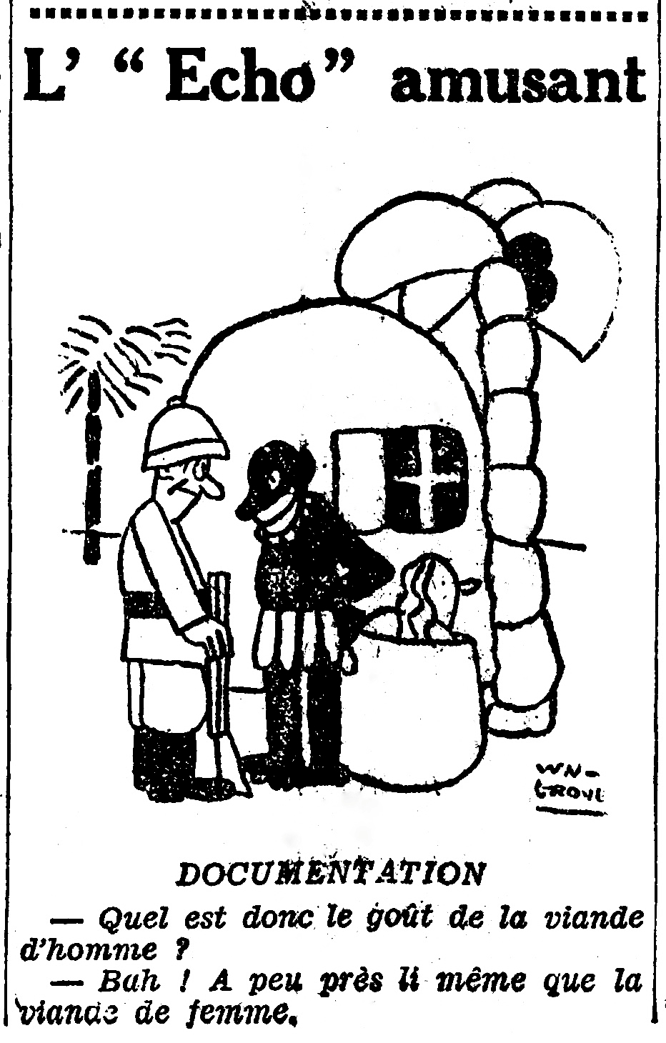 « Les naturels de l’Ouandsi, vaste territoire qui s’étend entre le lac Rodolphe et le lac Victoria-Nyanza, sont, parmi les anthropophages de l’Afrique centrale, ceux qui ont le mieux su concilier leurs habitudes de cannibalisme avec les raffinements de notre civilisation. Une délégation de l’Ouandsi, à la suite d’un séjour de quelques semaines au Jardin d’acclimatation, a rapporté au pays natal d’intéressantes coutumes européennes.