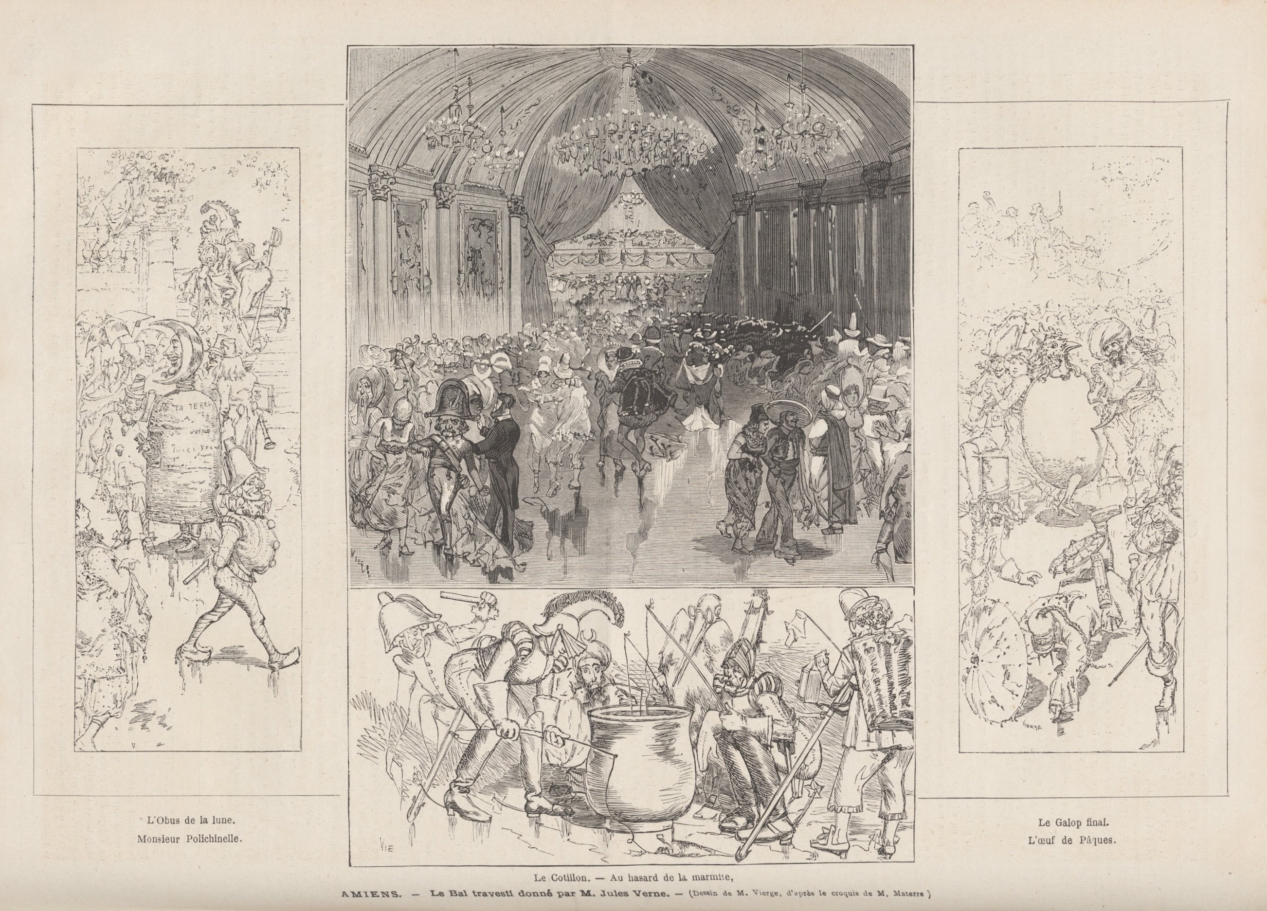 Monsieur Jules Verne a déjà trouvé le moyen de diriger les ballons, de faire vingt mille lieues sous les mers, de pénétrer au centre de la terre et de voyager autour de la lune. Il vient de tenter une entreprise peut-être plus difficile encore. Il a imaginé de mettre en action – à Amiens ! – un conte des Mille et une Nuits. En d’autres termes, il a invité les habitants de la ville où il a fixé sa résidence à prendre part à un bal costumé. Les compatriotes de M. Jules Verne se sont empressés de répondre à l’appel du célèbre romancier. Les journaux d’Amiens nous apprennent en effet que la fête donnée le 2 avril a dépassé toutes les splendeurs possibles.