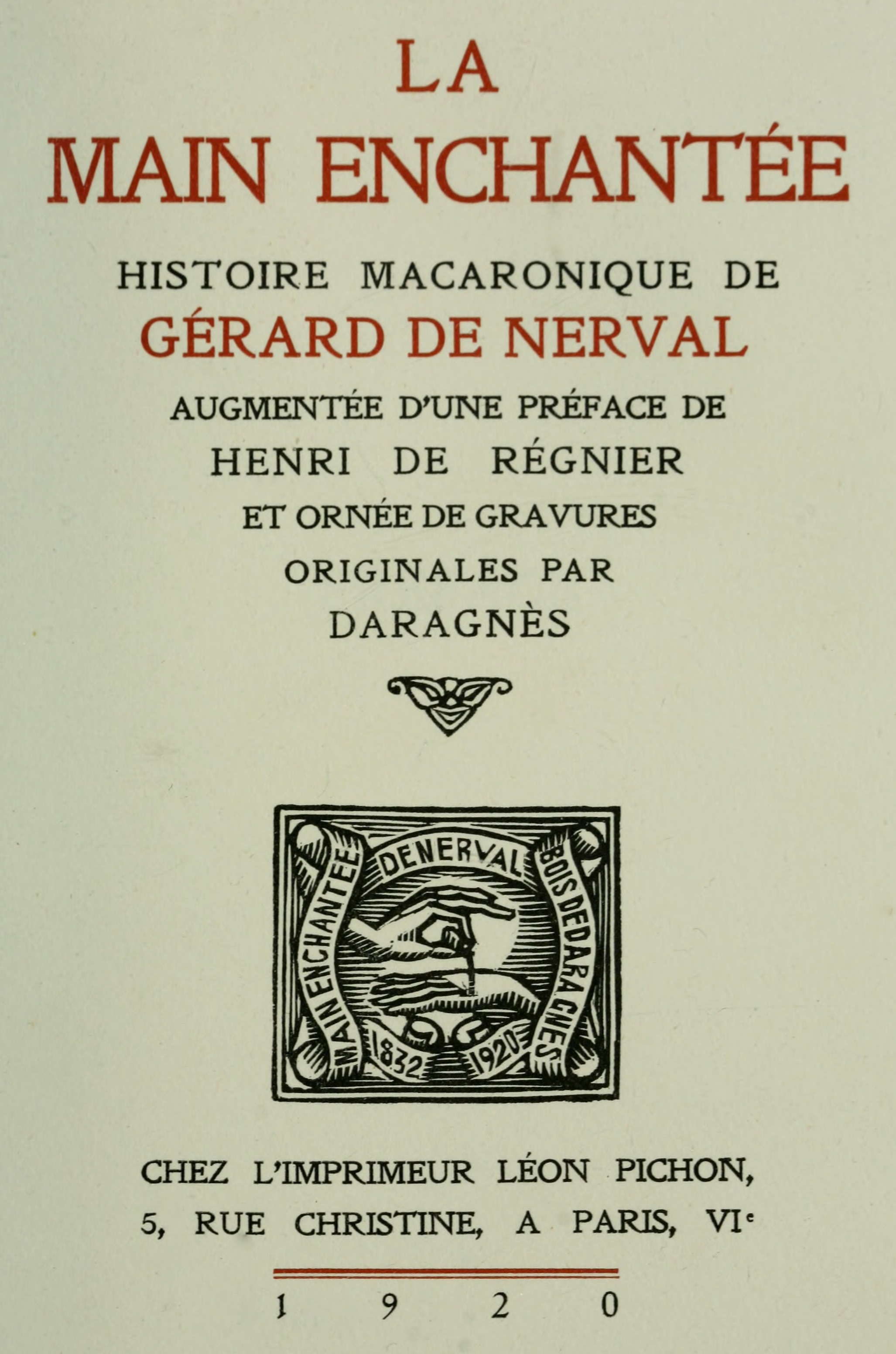 « Je ne sais, me dit Gérard, si vous connaissez ce petit récit fantastique que j’écrivis au temps du romantisme, en 1832 je crois ; cela s’appelait alors La Main de gloire et devait faire partie des Contes de Bousingot. Comme c’est loin ! On vient justement de réimprimer cette fantaisie. Un jeune artiste, Daragnès, y a ajouté de charmantes et pittoresques illustrations.