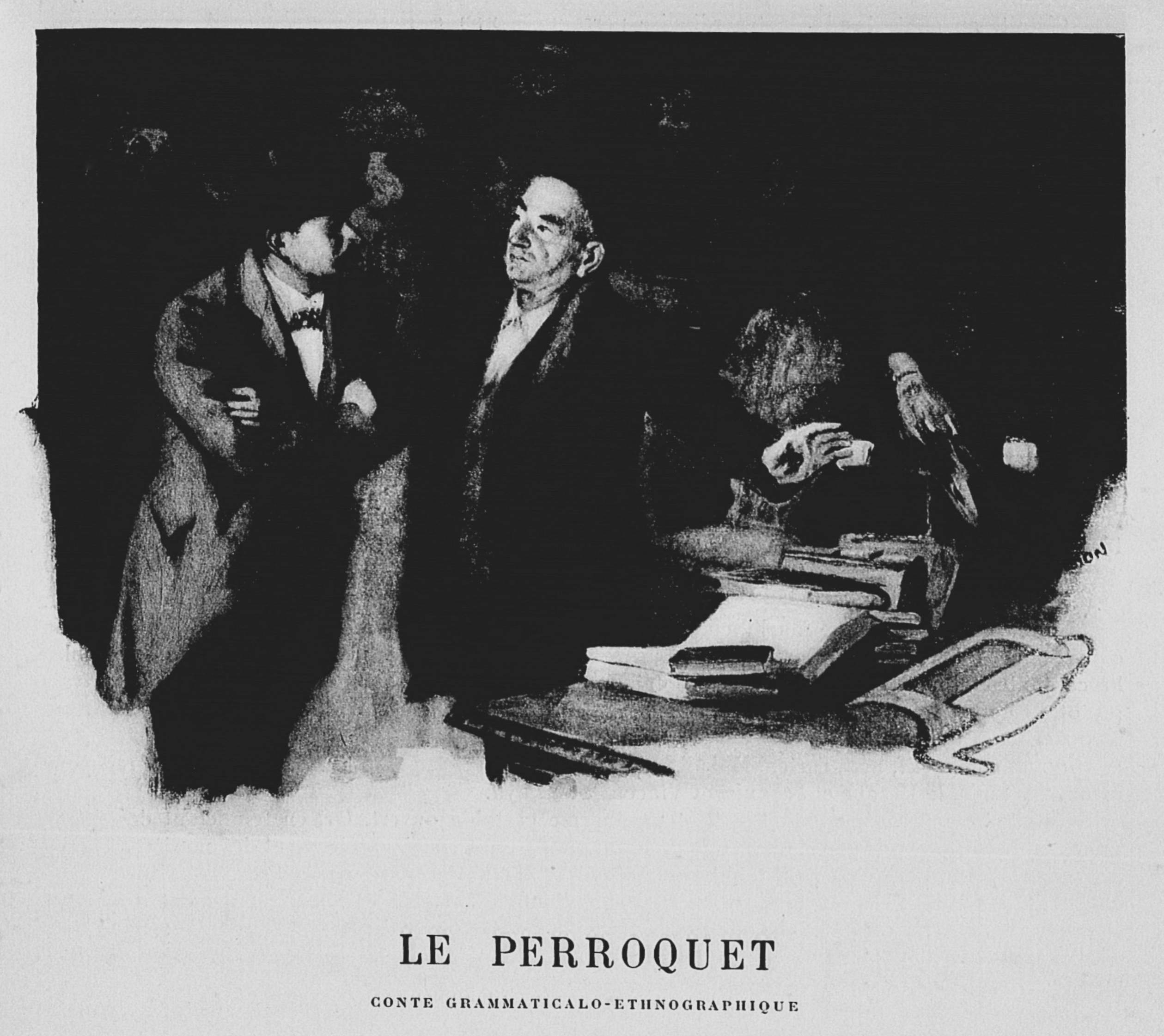 « N’oubliez pas, monsieur, continua le bric-à-brac, que le perroquet fait partie du lot. Parfaitement, le perroquet ! Et avec son perchoir, bien entendu ! »